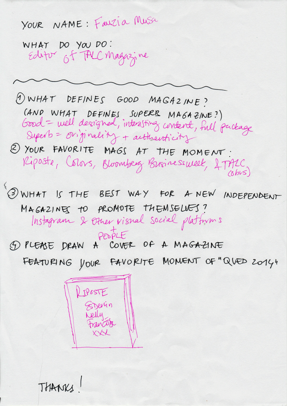 Žurnāla «Riposte» veidotājus apbrīnoju par to, cik labi saturs sader ar dizainu un cik pārdomāti viss ir nostrādāts. Ievērojusi, ka pati pērk tikai vīriešu žurnālus, Daniela Pendere nolēma izmantot brīvo lauciņu tirgū un izveidot tādu izdevumu, kādu pati gribētu lasīt — žurnālu ar labu dizainu, kas interesētu gudrām sievietēm. Žurnālu, kas svin to, ko sievietes sasniegušas, nevis to, kas viņām mugurā. Daniela ir īsta 90.gadu meitene, nesamākslota un ar raksturu, un tieši tāds ir viņas radītais žurnāls.