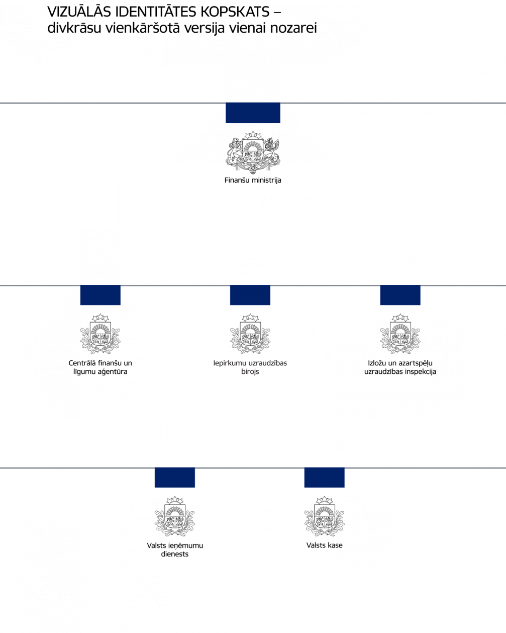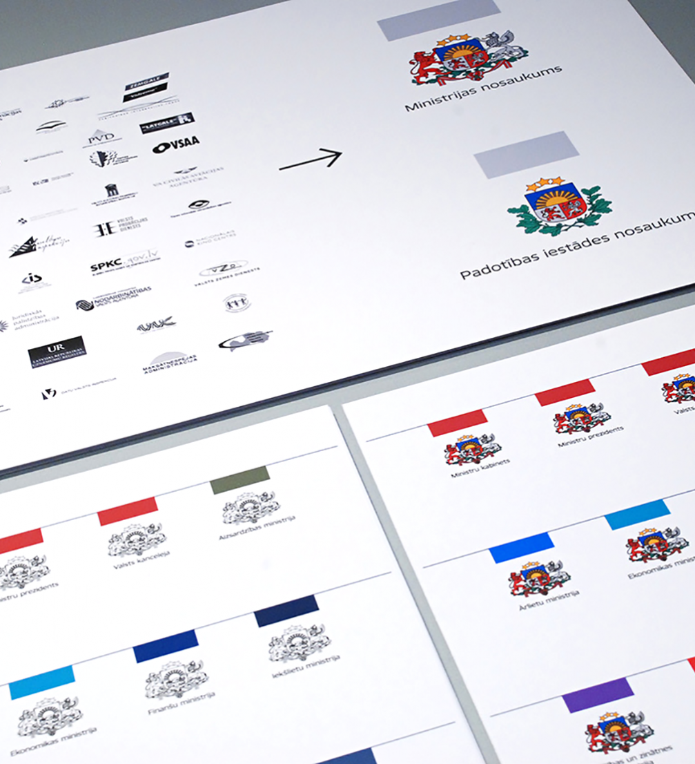 Jaunās vizuālās identitātes pamatā ir Latvijas valsts ģerbonis, kas simetriskā kompozīcijā ar burtveidolu un krāsu laukumu veido katras nozares identitāti un nodrošina vienotu, bet tajā pašā laikā atšķirtspējīgu valsts pārvaldes identitāti. Krāsu laukuma proporcija balstīta ģerboņa uzbūvē, bet piesātinātie toņi atrasti Latvijas ainavā. Atsevišķos gadījumos tos papildina melns, balts, zelts un sudrabs. Latvijas ģerbonis simbolizē valstisko funkciju, atbildību pret sabiedrību un valsts suverenitāti. Ministru kabinets, ministrijas un Valsts kanceleja izmantos lielo valsts ģerboni, bet padotības institūcijas — papildināto mazo valsts ģerboni.