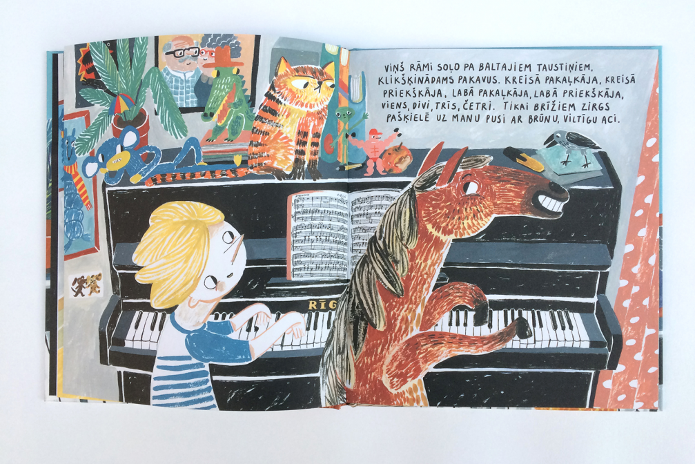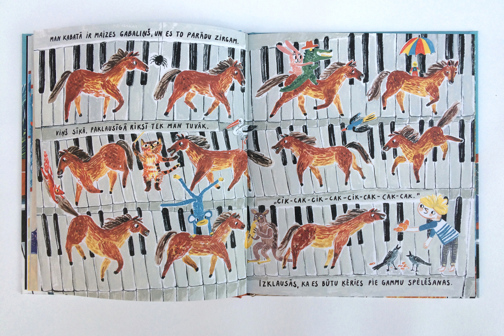 Izdevniecības «Liels un mazs» bilžu grāmata «Zirgā» ir stāsts par nevaldāmo fantāzijas skrējienu, ko bērnā izraisa klavieres, melnbaltie taustiņi un iespēja radīt skaņas.