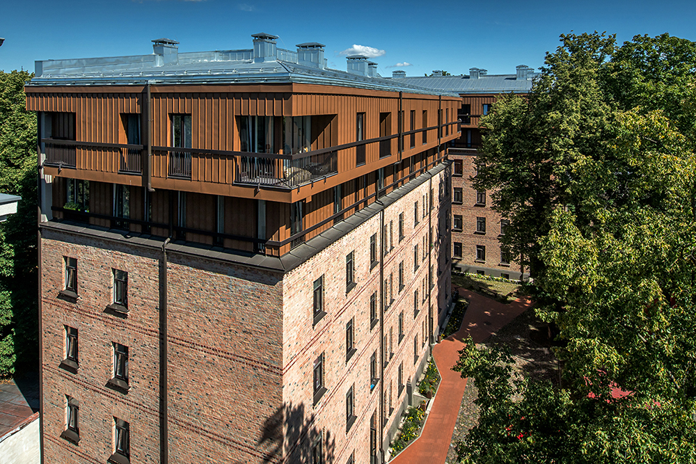 Arhitektu studijas «12 līnijas» vairāk nekā 100 gadus veco īres namu rekonstrukcija pagājušajā gadā arī saņēma Latvijas Arhitektūras gada balvu. Lai arī fasādes ēka atjaunota ar jūtīgu pietāti pret vēsturisko mantojumu, pagalma apjomos priekšplānā izvirzās kontrasts starp veco un jauno. Asprātīgi interpretējot juridisko dzegas definīciju, radīta konsolēta rūsējošā metāla plākšņu jumta virsbūve, kas ne tikai iespaido ar vizuālo efektu, bet arī ievērojami palielina jumta stāvu lietderīgo platību. Pagalmu telpas mājīgums un cilvēcība jo sevišķi novērtējami citādi paplukušajā centra perifērijā.