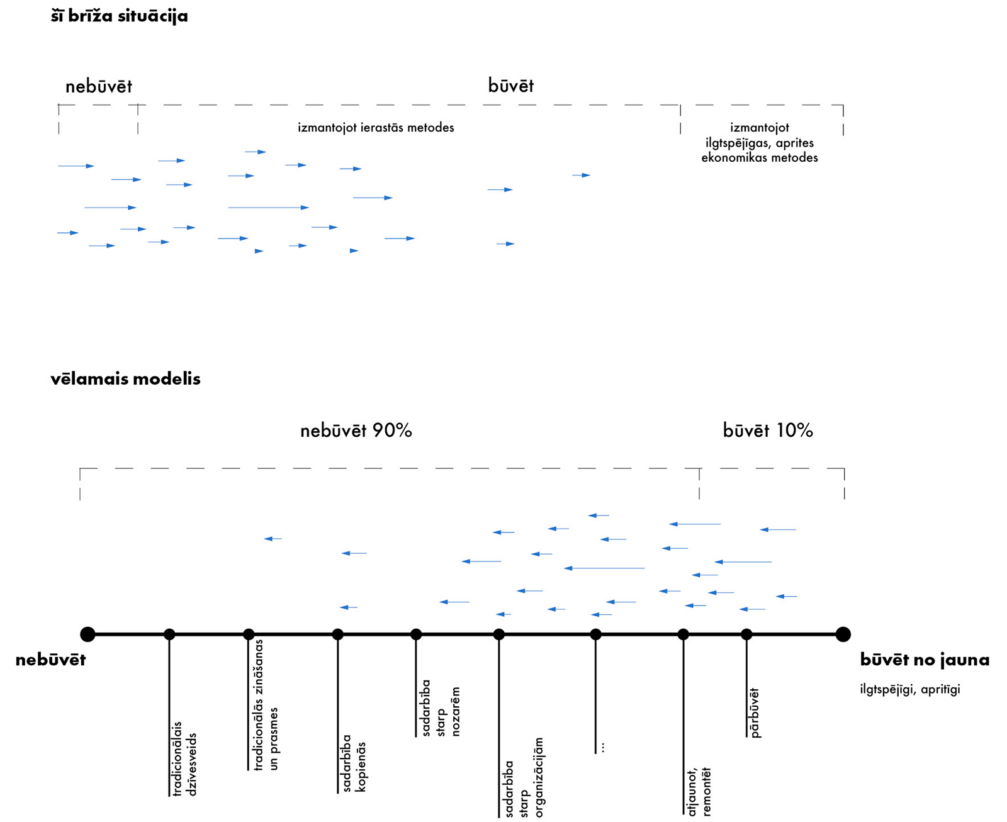 Pretēji, bet ne pretrunā ar bieži mūsdienās novērojamo lielo sabiedrisko ēku būvniecības realizāciju, kas īstenotas pēc modeļa — iztērēt līdzekļus, uzbūvēt un tad domāt, ko iesākt ar to, kas palicis pāri neizmantots — autori uzdod jautājumu: vai sabiedrība saprot, ko un kādā nolūkā tā būvē, pasūtot, piemēram, lielbudžeta sabiedriskas ēkas? Varbūt ir vērts atrast veidu, kā sadarboties gadījumos, kad «vienam ir govs, otram kartupeļi, vienam slimnīca, bet otram — koncertzāle, vienam ir skolas, bet otram — skolnieki»? Nebūvēšana, skatīta šādā aspektā, nav dīkstāve, nekā nedarīšana vai mākslinieciska arogance. Tā kļūst par konkrētu rīku, metodi, varbūt pat par pēdējo iespēju, kā nonākt pie jēgpilnas būvniecības. Izvirzot ideju par nebūvēšanu, autori nevēlas provocēt, bet gan reflektēt par iespējamo telpu un vidi, kur meklēt citādās zināšanas un kur iegūt šo paplašināto redzējumu.