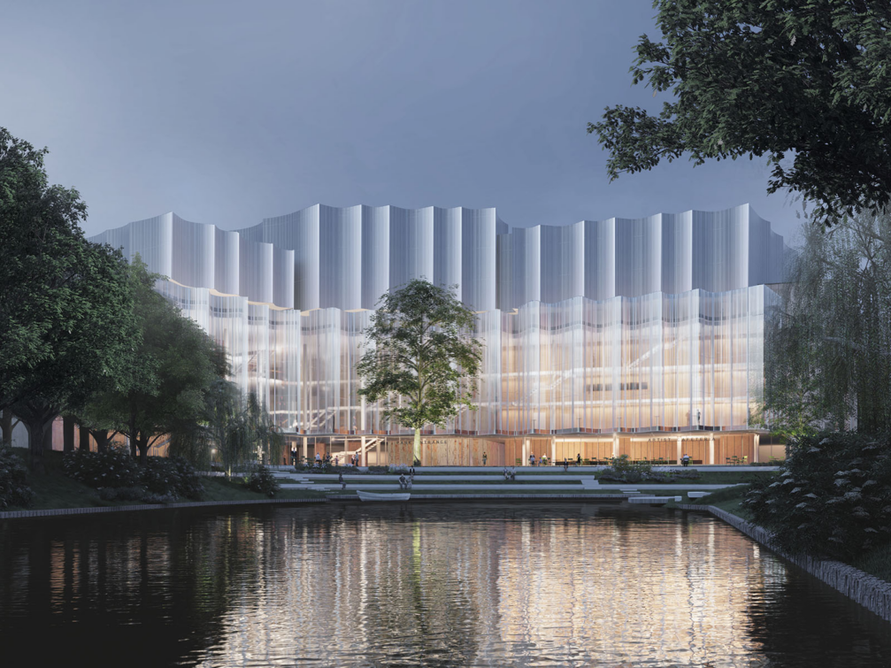 Izmantojot inovatīvus materiālus un tehnoloģijas, ēkas jaunā čaula radīs atvērtības sajūtu, integrējoties apkārtējā vidē. Vēsturiskajam apjomam raksturīgais materiāls — rozā dolomīts — tiks saglabāts un izmantots atkārtoti, papildinot to ar jauniem pārstrādāta betona elementiem. Savukārt stikla un glazētās keramikas apdares paneļi, kas atstaro gaismu, piešķirs ēkai mirdzumu un daudzveidību, mainoties līdz ar dienasgaismu un apkārtējo noskaņu. Fasādē jaunizveidoto atvērumu skulpturālā plastika no jauna interpretē Baltijas modernisma mantojumu un pauž jūtīgu attieksmi mijiedarbībā ar ainavu — viļņotās formas arhitektūrā ienesīs maigumu un plūdenumu, piešķirot telpai aicinošu noskaņu. Meta autori norāda, ka viens no projekta vadmotīviem ir «Filharmonija parkā» — pret kanālu vērstie stiklotie erkeri ļaus koncertzāles apmeklētājiem «ienirt» skaistajā kanālmalas ainavā.