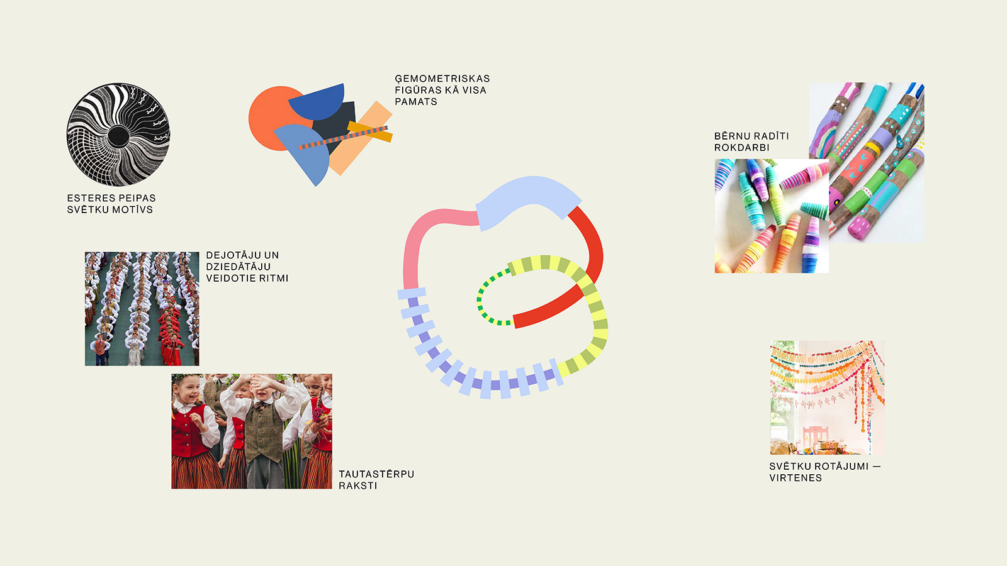 Ņemot vērā grafisko elementu raibo raksturu, pārējie vizuālās identitātes dizaina elementi ir lakoniskāki, lai nodrošinātu harmonisku kopskatu un ļautu viegli nolasīt informāciju. Svētku grafisko simbolu papildina vārdzīme, kas sasaucas ar 2023. gadā Vispārējos latviešu Dziesmu un Deju svētkos lietoto dizainu, saglabājot dalībnieku uznāciena vizuālo ritmu, bet aizstājot burtveidolu ar rotaļīgāku fontu. Identitātes pamatā ir izmantots bēšais tonis, kas arī aizgūts no Vispārējiem dziesmu un deju svētkiem, kā arī kontrastējošs zilais tonis. Akcentiem izmantotas zaļās krāsas no Latvijas pļavām un mežiem, zilgani debesu toņi, kā arī sārtie toņi no tautumeitu vainagiem un brunču rakstiem.