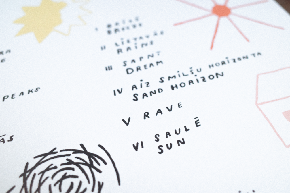 Ilustratore atklāj, ka ir pieradusi strādāt ar tekstu un attēlu, bet «skaņa un attēls ir pavisam kas cits». Strādājot pie albuma noformējuma, Lote «Nest» klausījās uz austiņām, mēģināja sajust tā noskaņu un atsauca atmiņā Reiņa stāstus par ceļojumiem. Visspilgtāk viņa atceras mūziķa «trako ideju» stopēt uz tuksnesi. Tieši ar šo stāstu viņai radās izteiktākās asociācijas, tāpēc abstraktā veidā albuma vizuālajā noformējumā parādās saule, ūdens, kalni, mēness un caur krāsām — arī tveice. «Tā kā Reinim dziesmās bieži pavīd elementi no dabas, tādos sadalīju arī vāka priekšpusi. Domājot par «Nest», kas ietver arī ligzdas nozīmi, prātā nāca izkaltušie krūmi, kas klejo pa tuksnešiem un mazliet atgādina ligzdas. Man tie atgādina arī Reini, kurš tik daudz ir ceļā, tajā skaitā tuksnešos. Tādu krūmu arī ielikām vākam aizmugurē un B pusē — platei viducī.»