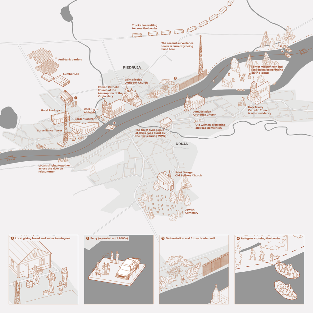 Piedrujas–Drujas ciems atrodas uz Latvijas un Baltkrievijas robežas, kur šobrīd tiek pabeigta apmēram 145 km gara metāla žoga un citu aizsardzības objektu izbūve, lai ierobežotu nelegālo migrāciju, ko Latvija un citas ES valstis uzskata par Baltkrievijas īstenotu hibrīduzbrukumu, un stiprinātu valsts un NATO austrumu robežas drošību. Eseja par Piedruju–Druju ir daļa no pētniecības projekta, ko vada baltkrievu dizainere Darja Ahrameika un latviešu pētniece Danute Līva. Pastaigā viņas pievēršas ciemata jauktajai kultūrainavai, sašķeltajai kopienai, humānajai krīzei un pierobežas joslas militarizācijai.