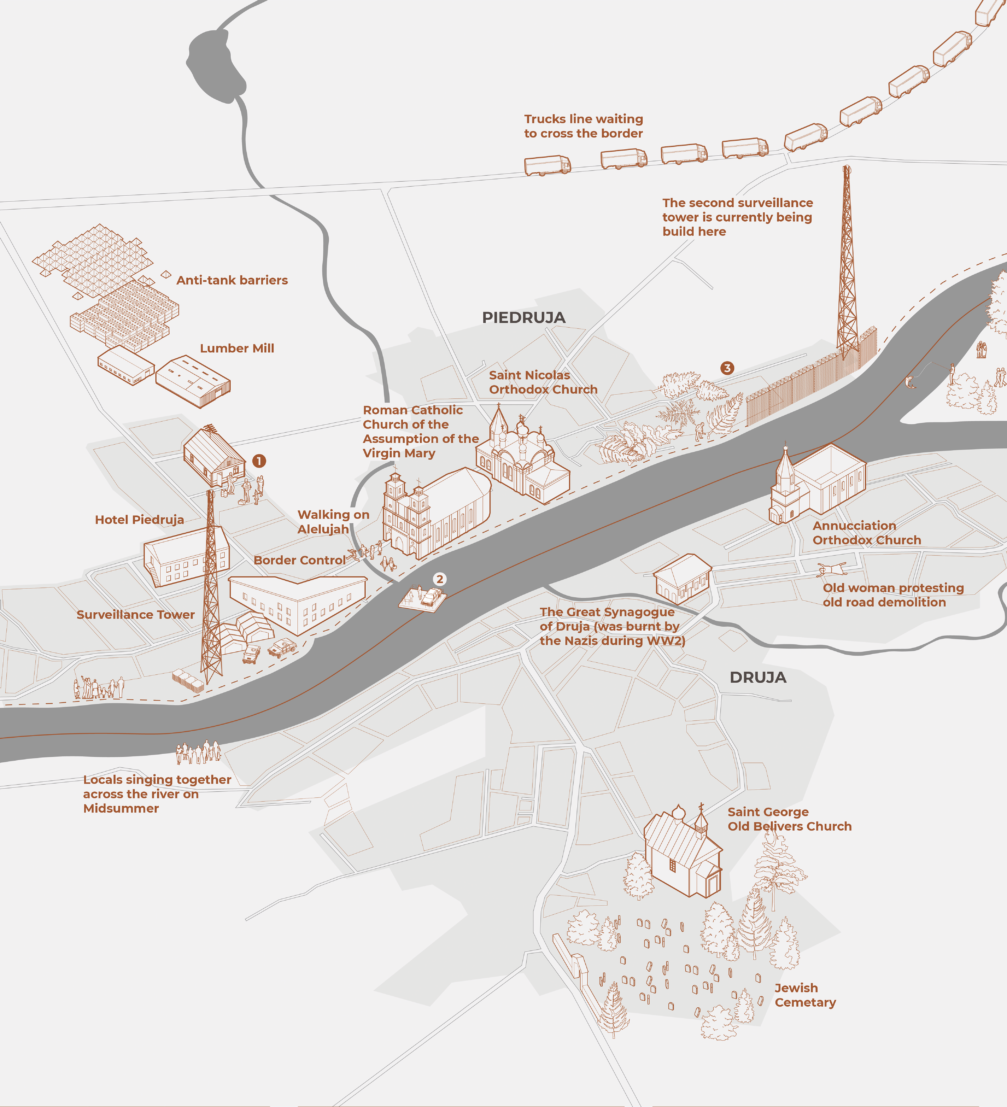 Pirms gada es, mākslinieciskā pētniece, un mana draudzene Darja Ahrameika, telpiskā dizainere, sākām apmeklēt un pētīt Piedruju–Druju. Diemžēl šis ceļojums mums ir bijis nelīdzens, un pētīt šo sadalīto ciemu uz vietas ir sarežģīti. Mēs apmeklējām Piedruju divas reizes — pirmo reizi 2024. gadā un vēlreiz 2025. gadā —, un lauka pētījumu pieejamība strauji mainījās pat viena gada laikā. Šogad Darjai tika atteikta robežšķērsošanas caurlaide, jo viņas Baltkrievijas pase tika izmantota kā iegansts, lai apgalvotu, ka viņa rada draudus nacionālajai un valsts drošībai. Apmeklējot vietas ar automašīnu, var gadīties, ka nedrīkstēs izkāpt pat tikai, lai apskatītu, piemēram, baznīcu. Šie šķēršļi traucē saprast, kas notiek valsts nomalē un pamanīt vardarbību pret bēgļiem.