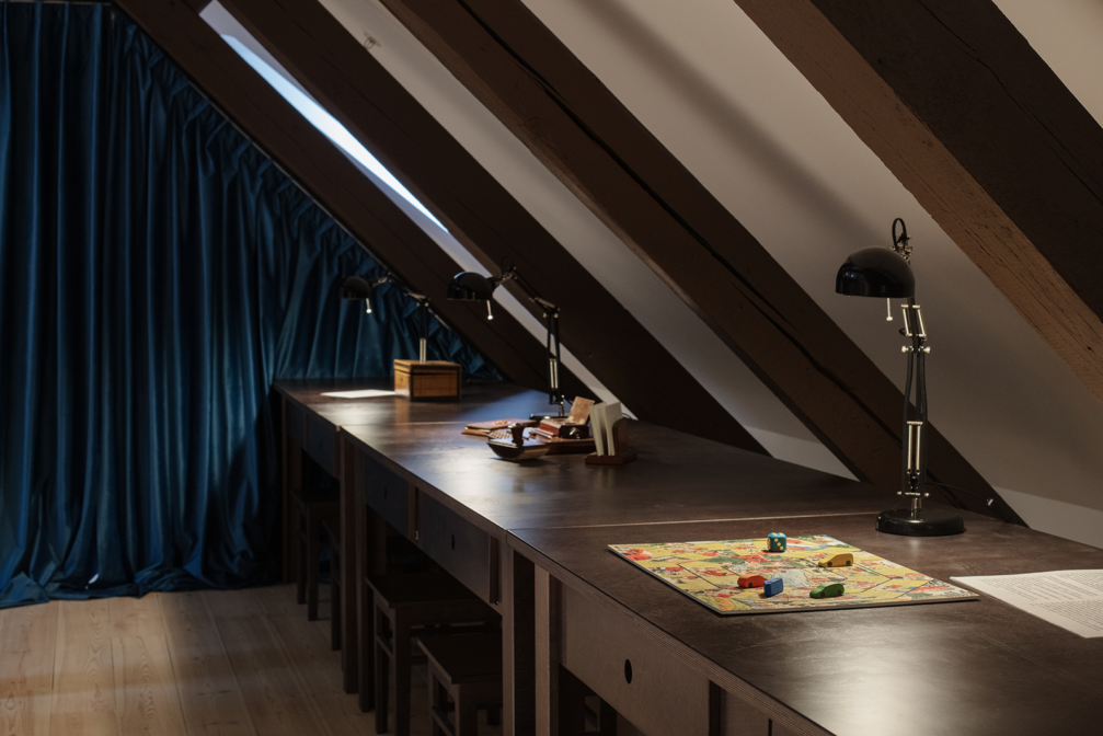 Ekspozīcijas iekārtota bēniņos — telpā, kas populārajā kultūra parasti raisa asociācijas ar noslēpumiem, pagātnes liecībām un negaidītiem atklājumiem. «Vēlējos, lai bēniņos ienāk noskaņa, kas atgādina «Nebeidzamā stāsta» un «Harija Potera» sajūtu. Gribējām radīt vietu, kur rodas brīnums un iedzīvojas iztēle — telpu, kur bērni var aktīvi iesaistīties paši un izzināt vēsturi caur taktilo pieredzi un jēgpilni rotaļāties. Rotaļa man vienmēr bijis vistuvākais veids, kā mācīties un atklāt jauno,» stāsta viena no ekspozīcijas autorēm Una Grants.