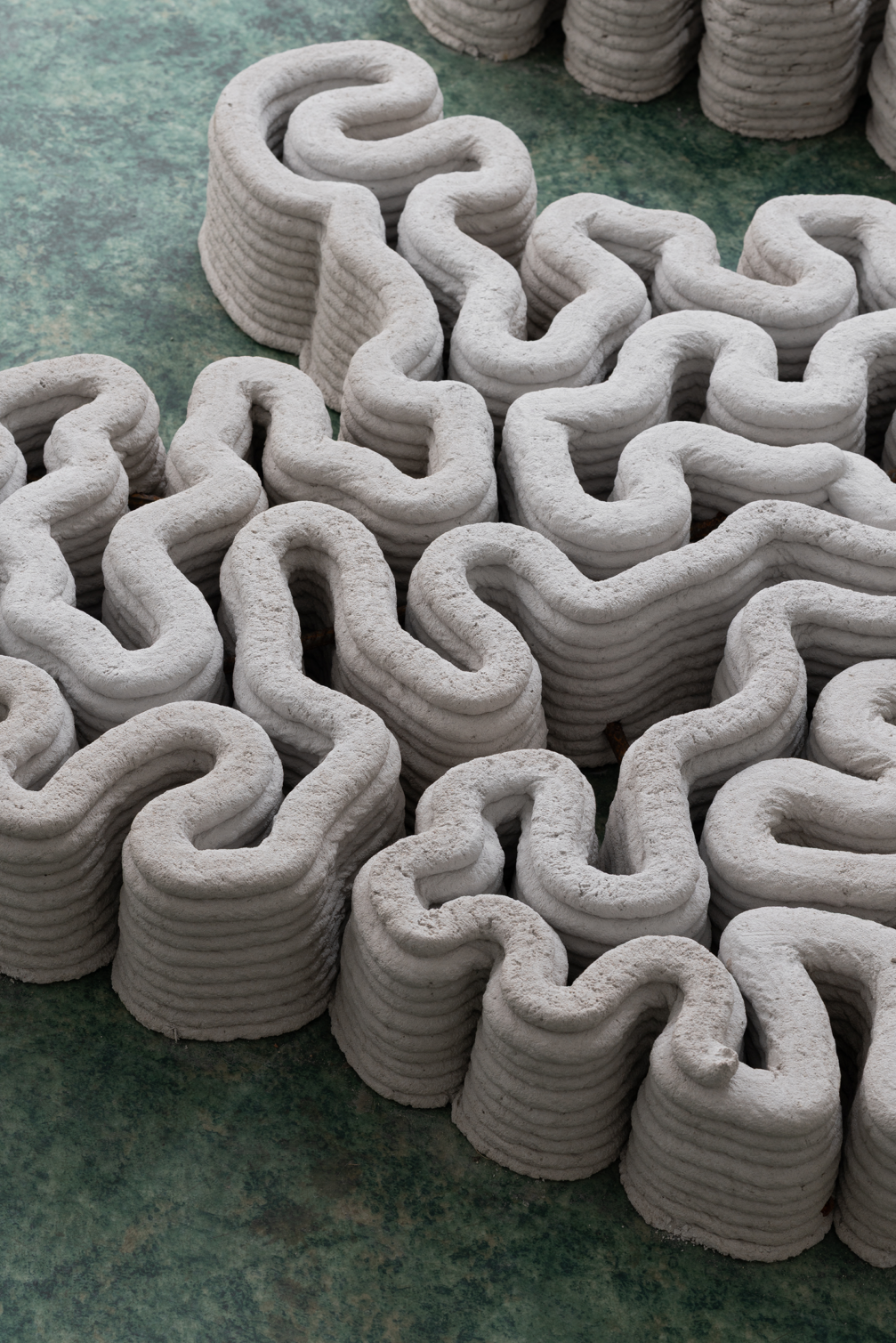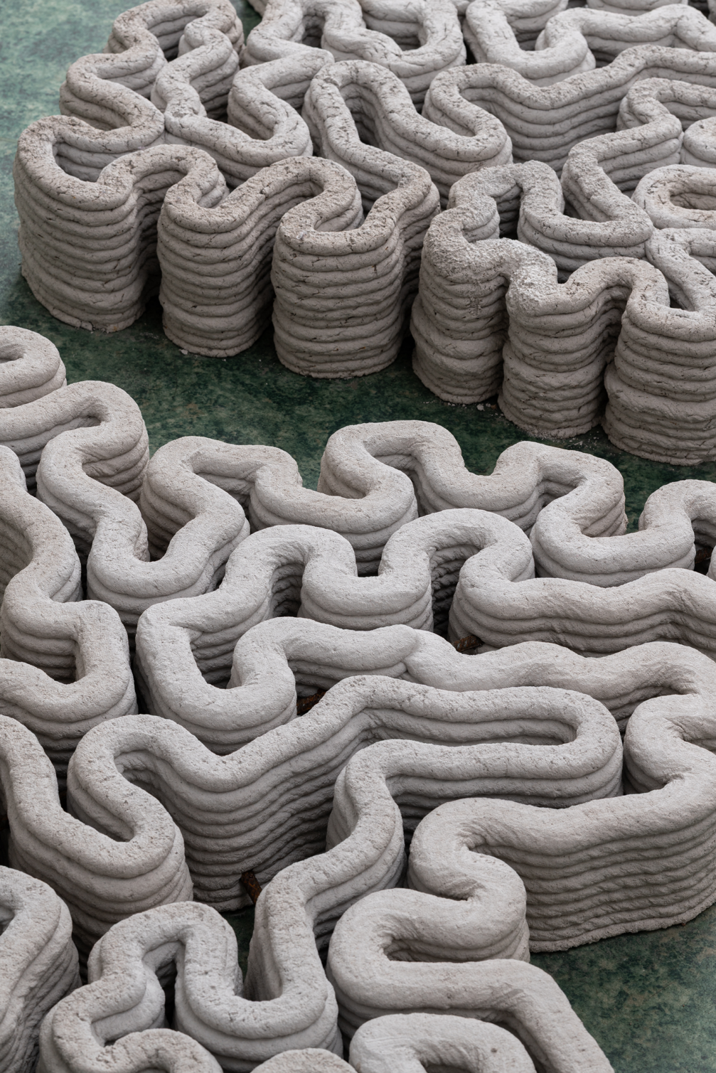Šis darbs tapis sadarbībā ar Rīgas Tehniskās universitātes (RTU) 3D betona zinātnisko laboratoriju, kur tiek testētas jauna veida mazāk emitējošas betona alternatīvas un eksperimentāli arhitektūras elementi. Laboratorijas vadītājs Māris Šinka uzsver, ka sadarbība ar dizaineriem, iesaistoties radošos projektos, ļauj palūkoties uz jaunu materiālu un tehnoloģiju attīstību plašāk. «Mūsu mērķis ir attīstīt būvmateriālus ar iespējami zemāku ietekmi uz vidi, un šī ietekme nav tikai CO₂ vai resursi — būvētā vide tieši ietekmē arī biodaudzveidību. Mikrodzīvotņu risinājumi ir praktisks veids, kā līdzās cilvēku infrastruktūrai integrēt vietu citām sugām,» komentē Māris. «Mākslas objekts izstādē ir kā starpforma starp ideju un prototipu — tas ļauj sabiedrībai saprotamā veidā parādīt, ko nozīmē ilgtspējīgi materiāli un kā tie var tikt lietoti. Pēc izstādes testēšana reālā vidē mums būs īpaši vērtīga, jo tā ļaus mums saprast, kas notiek ar materiālu, kad objektu ietekmē mainīgie apstākļi pilsētvidē — kā 3D drukātā ģeometrija un materiāla sastāvs ilgtermiņā saglabā formu, virsmas kvalitāti un funkcionālo integritāti, un vai risinājums ir pietiekami robusts praktiskam pielietojumam ārpus izstādes konteksta.»