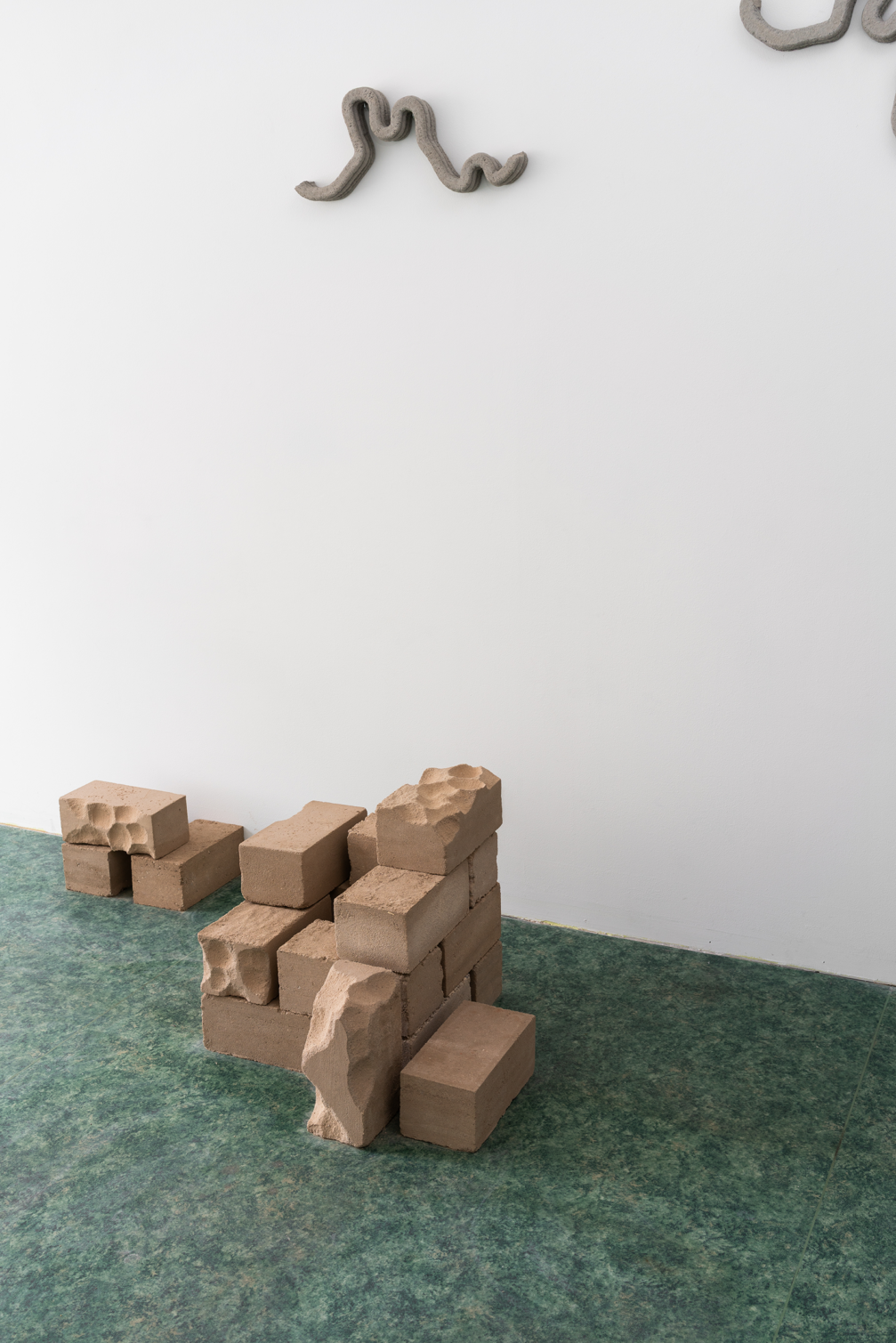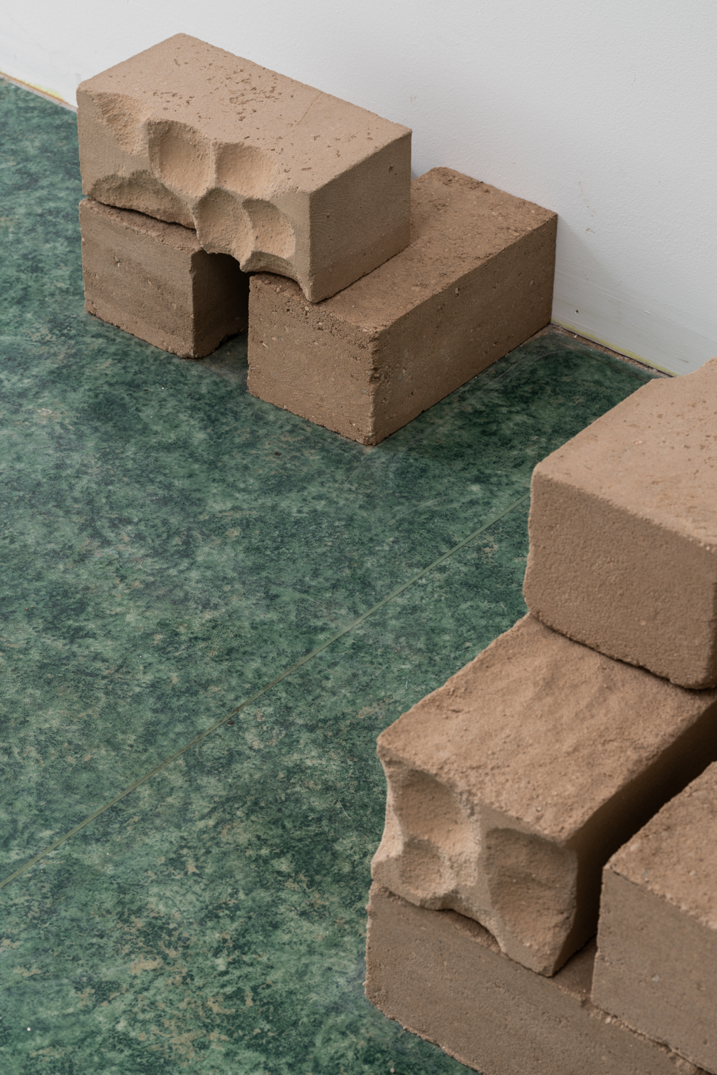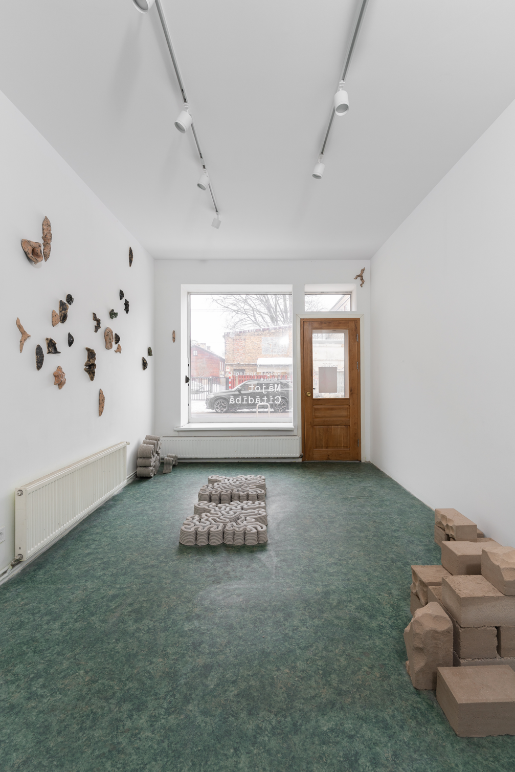 «Sikspārņi pasauli uztver caur eholokāciju — viņiem tukšā telpa ir piesātināta ar skaņas viļņiem, kas palīdz identificēt attālumus līdz virsmām. Tas, ko cilvēks uztver kā plaisu, sikspārnim ir strukturēta un dzīva telpa,» stāsta Rūta un Tīna. Izpētes procesā dizaineres uzņēma foto ar dažāda veida nepilnībām Grīziņkalna apkaimes apbūvē — plaisām, spraugām un caurumiem —, lai tālāk to dobumus atveidotu akmens masā, materializējot negatīvo telpu, kas parasti mums paliek neredzama. «Katra tāda maza plaisa un iedobe mums var šķist maznozīmīga, toties kādam citam, piemēram, sikspārnim tas var nozīmēt patvērumu, drošību un mieru. Ar šo darbu aicinām pārvērtēt pilsētvides «nepilnības» un dažādās tekstūras kā ekoloģisku vērtību.» Ideju par nepilnībām kā bagātinošu pilsētvides daļu turpina arī darbs «Erodētā mājvieta» — no blietētas mālu un smilšu masas veidots ķieģeļu krāvums, kas atsaucas uz laikapstākļu un vides ietekmes noārdītu ķieģeļu sienu Matīsa ielā.