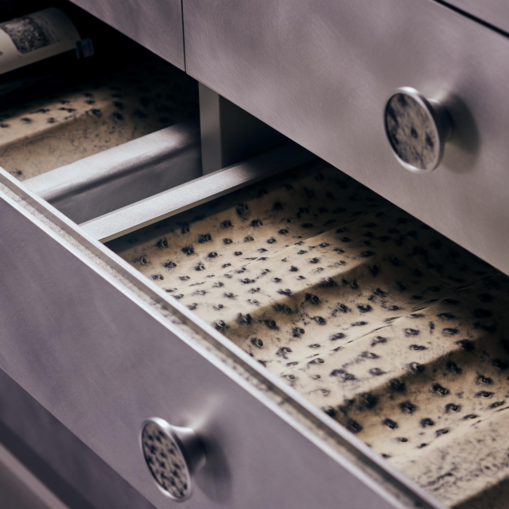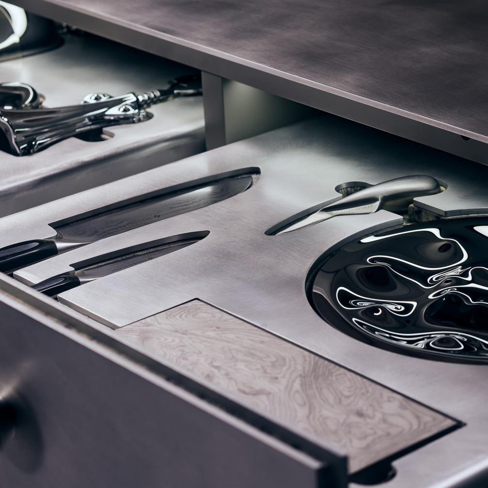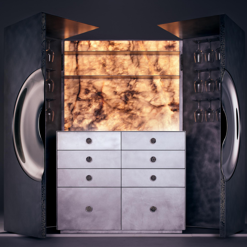 «Orion» bāra skapja dizainu radījis «Kanttari» dibinātājs Renāts Kotļevs sadarbībā ar mākslinieku Arti Nīmani, kura veidotais greznais stikla rokturis ir dizaina fokālais punkts, «transformējot skapja atvēršanu nesteidzīgā rituālā». «Orion» ārējā apdare ir lakoniska, tā veidota no atstarojoša, spoguļota metāla, savukārt atverot skapja durvis, atklājas dažādi grezni materiāli — no aizmugures izgaismots marmors, ar strausa ādu izoderētas atvilktnes un citas taktilas detaļas. Greznību veido arī mēbelē integrētās funkcijas — skulpturāli glāžu turētāji, vīna dzesētājs un īpaša atvilktne austerēm.
