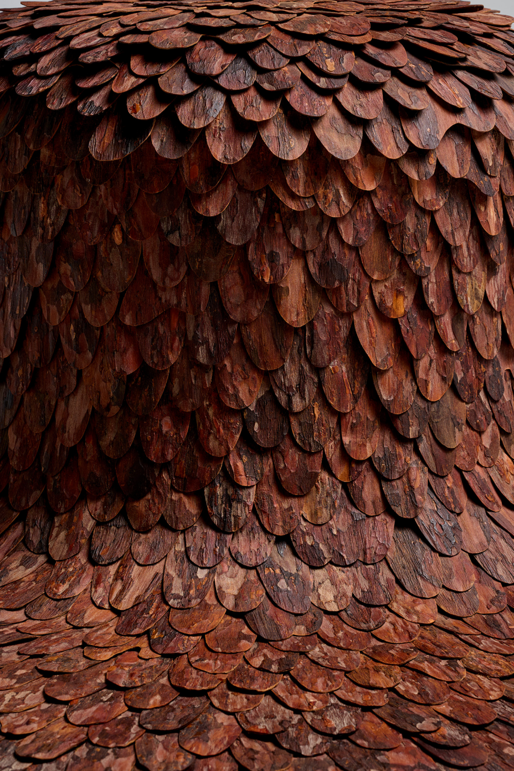 «PineSkins» ir unikāls materiāls, ko dizainere radījusi 2018. gadā. Lai gan miza veido līdz pat 20% no priedes koka, kokrūpniecībā tā lielākoties tiek uzskatīta par blakusproduktu. Dizainere ievāc svaigu mizu no nocirstiem kokiem un apstrādā to, izmantojot dabiskus mīkstinātājus. Pufa izgatavošanai no materiāla tiek veidotas zvīņas, kas raisa asociācijas ar pašu koku.