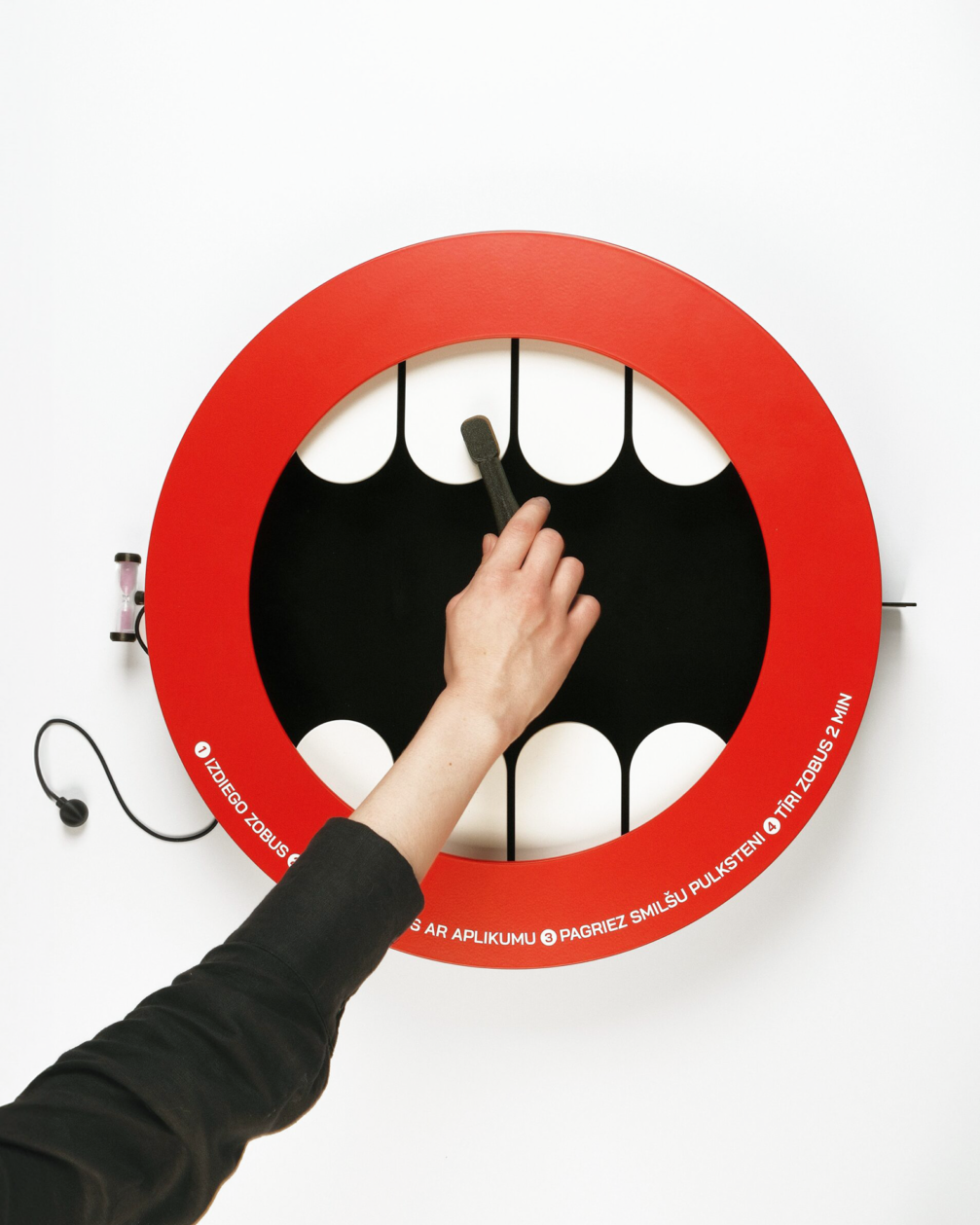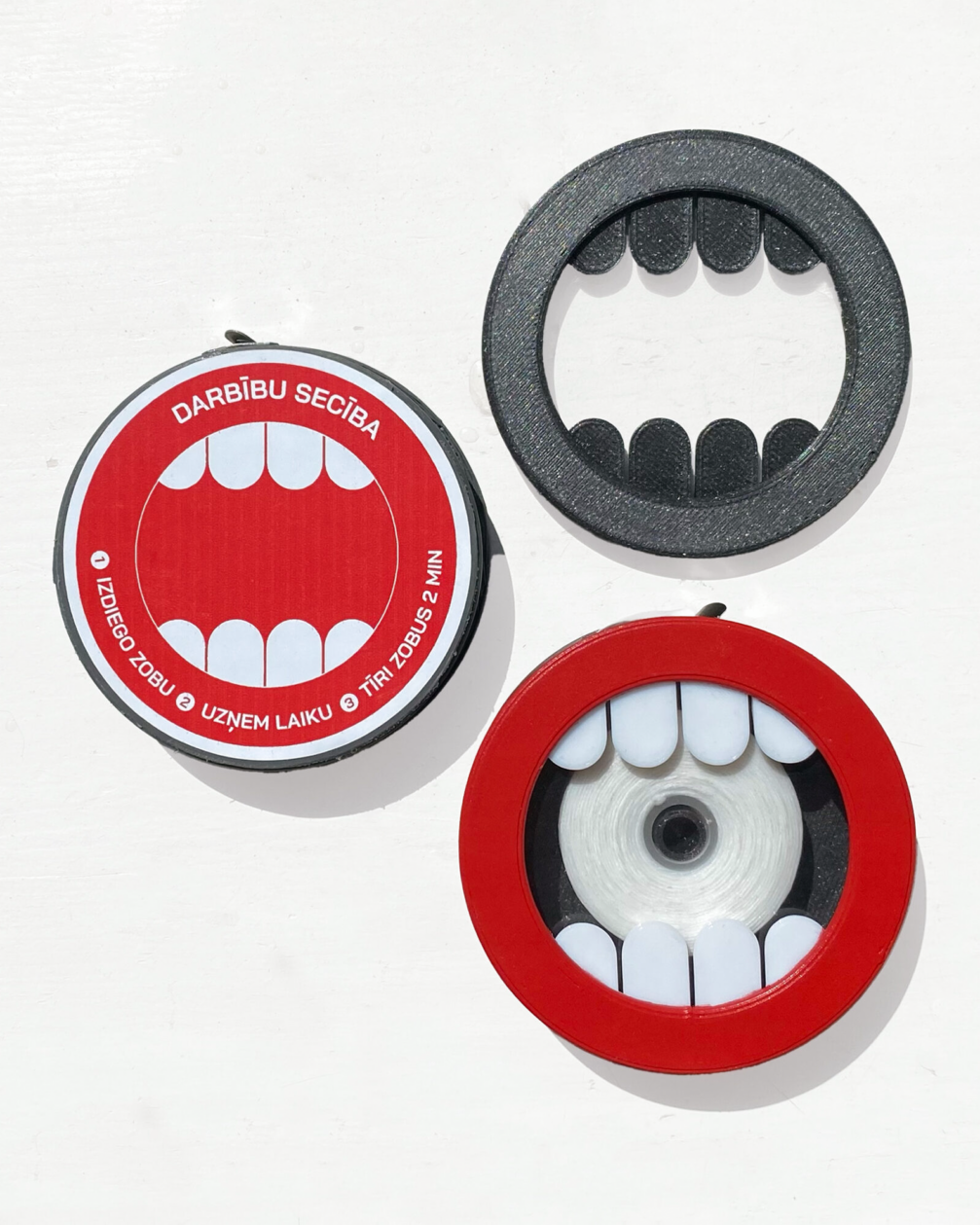 Lai nostiprinātu apgūtās zināšanas arī pēc vizītes, dizainere izstrādājusi arī informatīvu zobu diega kastīti, kas ir mērogā samazināta rotaļlietas versija un atkārto tās spilgto vizuālo identitāti. Kastītē iespējams ielikt un nomainīt zobu diega spoli, un reizē tā darbojas kā ikdienas atgādinājums par pareizu mutes higiēnu bērnam saprotamā, draudzīgā formā.