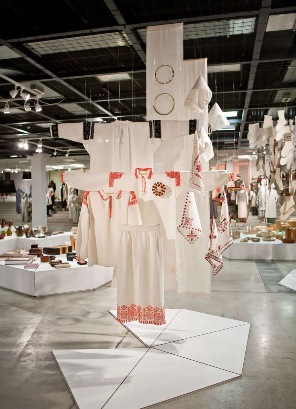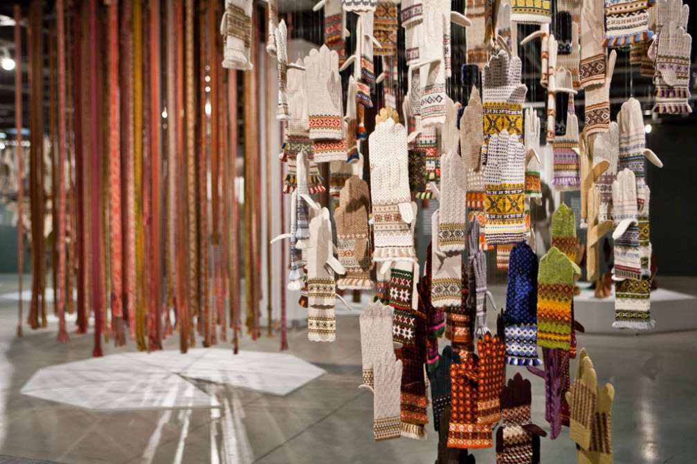 The exhibition shows nearly 2000 pieces — scarves, blankets, mittens, gloves and socks, wickerwork, ornaments, leather goods and ceramics from all regions of Latvia. More than 900 masters of traditional decorative arts and nine contemporary design brands take part in the exhibition. Authors of exhibition’s concept and layout are: master of traditional crafts Dagmāra Prīberga, designer Daina Vītoliņa, architect Laura Pelše and photographer Gints Mālderis. The exposition is conceptually divided in two classical elements — sky and earth. Immensity of the earth unites the «heavier» items: ceramics, glass, leather and wood. Sky is made of the airier things: belts, wooden spoons, gloves, shoes, which hang from the ceiling in clusters. A motive of lace interweaves the exhibition, and its themed parts are accompanied by folk songs, which contribute to the atmosphere of the space. Daina Vītoliņa reveals the meaning of the title «The song gets otherwise» — unlike choristers, craftsmen sing their songs out with their hands, making objects.