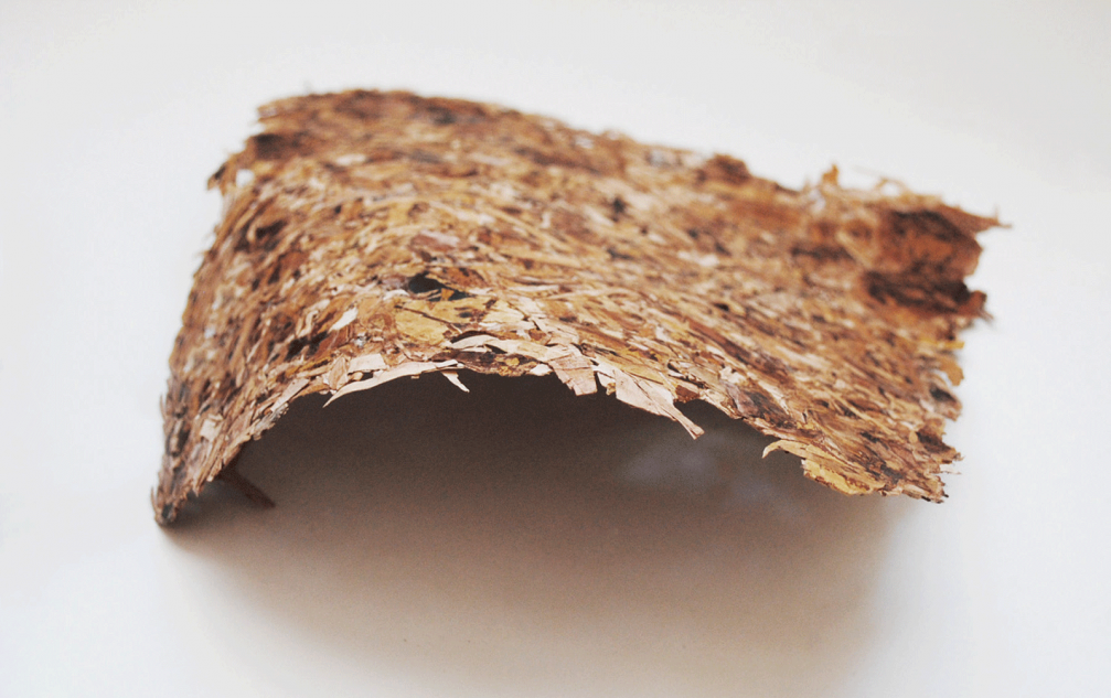 In a collaboration with Institute of Polymer Materials at Riga Technical University Kristīne carried out practical experiments with birch bark collected with both manual, as well as industrial methods of «Latvijas Finieris» manufacture. She researched the different treatment possibilities, tearing the bark in flakes, crushing it into grains and elongated fibers, as well as grinding. Different steps of preparation, as well as post–treatment with wax and varnish were tested. The samples have been made using hot press technology, which means treating bark fibres in a high temperature and under pressure. Various kinds of «Lokāmtāss» have been created, with different textures and degrees of flexibility.