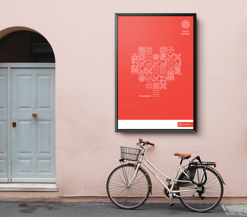 The logo is the traditional Talsi sun in a new form and colour scheme. The colour palette for every town and parish is designed considering the history, heraldic, symbols and values of the place. Along with the municipality logo, the main element of the visual identity is town and parish, thematic, informative and location pictograms. They include the values, affiliation and well–known symbols of Talsi. The pictograms make up the pattern of the municipality, that alludes to the traditional symbol of the municipality — the Talsi traditional skirt. «The pattern of pictograms unites the important Talsi Municipality characteristic elements in a graphic net that can be used in the digital and urban environment, in interior design and printed materials for various purposes. Often it serves as a background or additional pattern. The symbols offer countless possibilities,» the design studio Teika comments.
