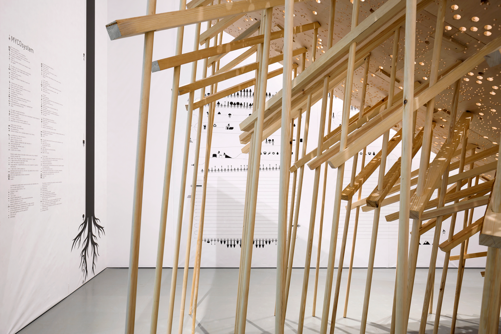 MYCOsystem is a design project conceived for the Polish pavilion at the recent Triennale Milano. Co-created by visual artist and curator Małgorzata Gurowska, design theorist Agata Szydłowska, and Maciej Siuda, an architect and designer, the project is a study of just one material — wood — as seen from the vantage point of a variety of species. Humans perceive timber as a construction material, while for fungi it constitutes a food source. It may also be considered a part of a living plant, an organism with a potential of symbiotic coexistence. The installation MYCOsystem asserts that design ought to consider the entire life cycle of an object and aims to redefine the relationship between humans, fungi, and trees as a cooperation instead of exploitation.