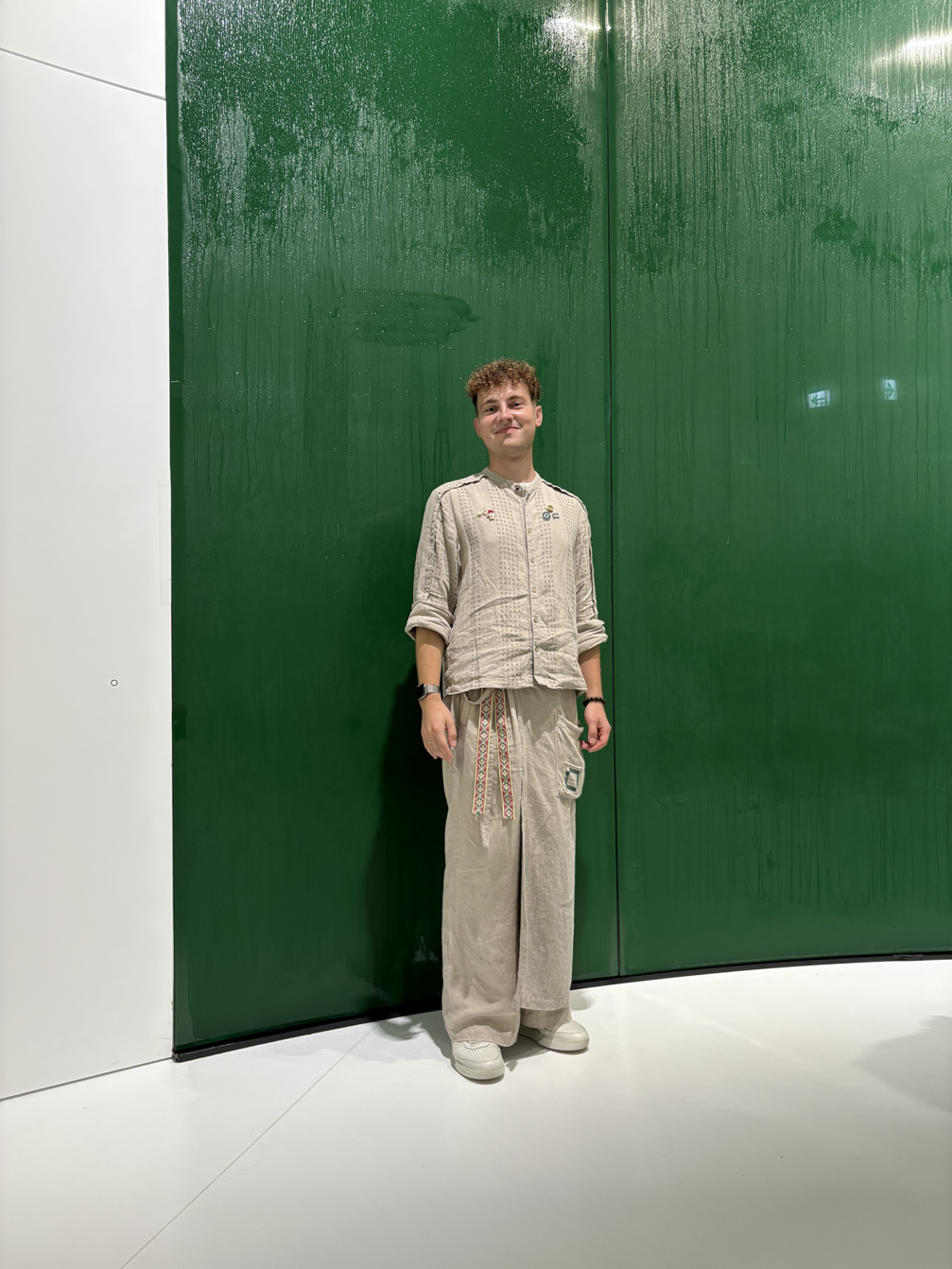 «We can style our looks however we want by combining different items of clothing, depending on our mood or the weather. Each employee can look like their unique self, and clothing can also be interpreted individually — for example, the apron can be used as a skirt or dress,» Matas Jagelavičius, one of the guides at the Baltic Pavilion, who has just graduated from Doshisha University in Kyoto, where he studied business and economics. «Every day we receive compliments about our outfits, people take photos with us, and many ask if the clothes are available for purchase.