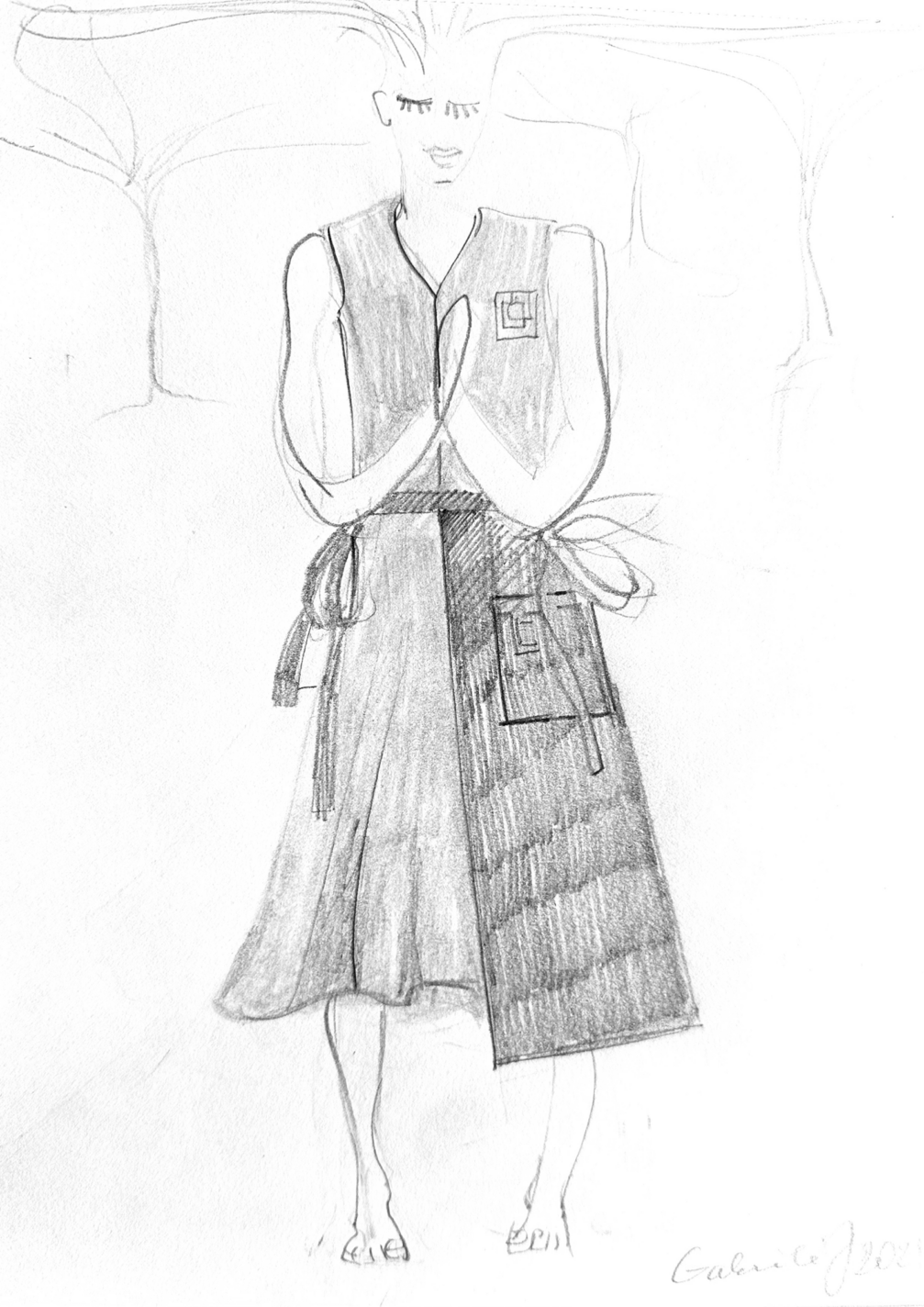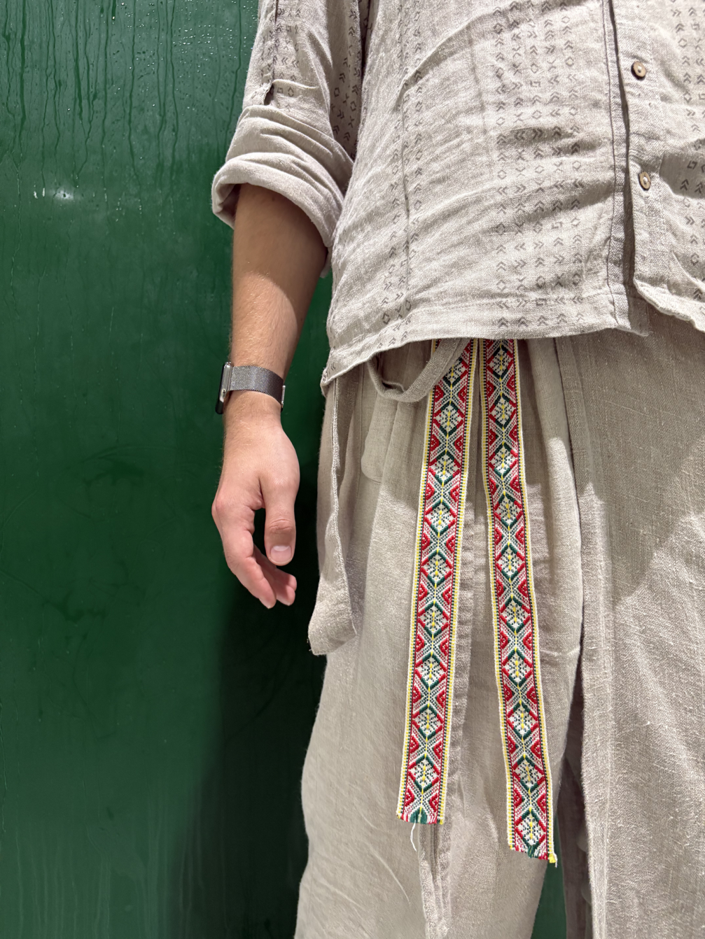 Despite the fact that all the garments are sewn from a single piece of fabric, the designer wanted to emphasise that we are diverse in our unity — just as every person is unique, Lithuania and Latvia, although closely related, are two distinct countries. «I wanted to give every guide the opportunity to express their individuality and represent their country by selecting different layers,» says Gabrielė. «The guides’ outfits are not fixed, they are not uniforms, allowing each guide to express their personality and look unique.» An essential part of the uniform is the apron — a piece of clothing with deep roots in Latvian and Lithuanian cultures. Gabriele explains that it sends an important message to visitors: that we are ready to work and cooperate.