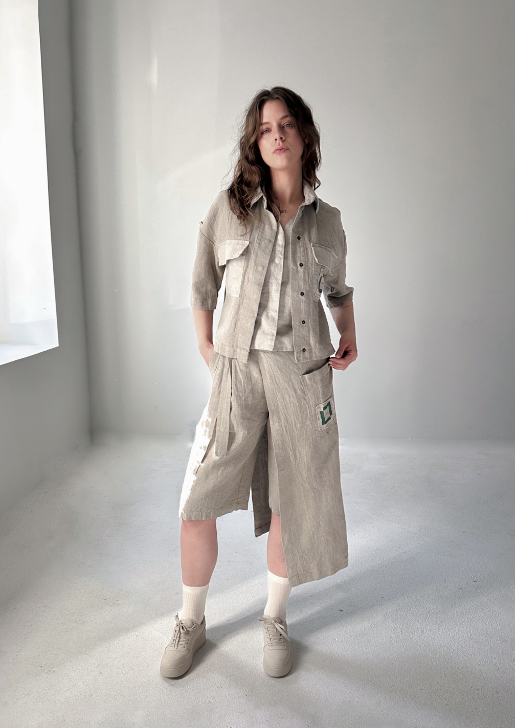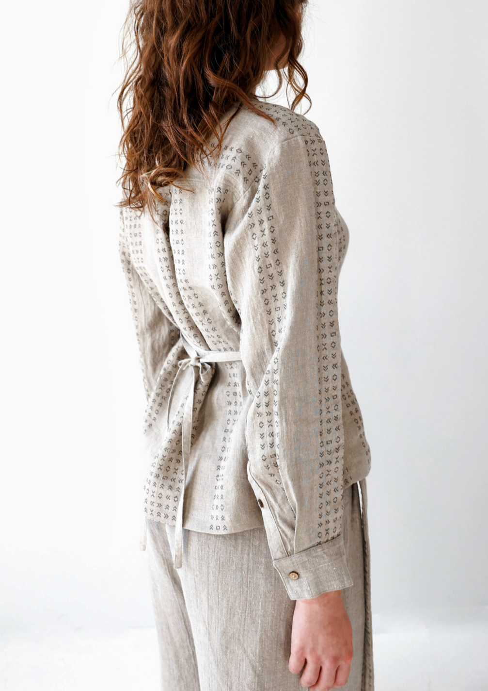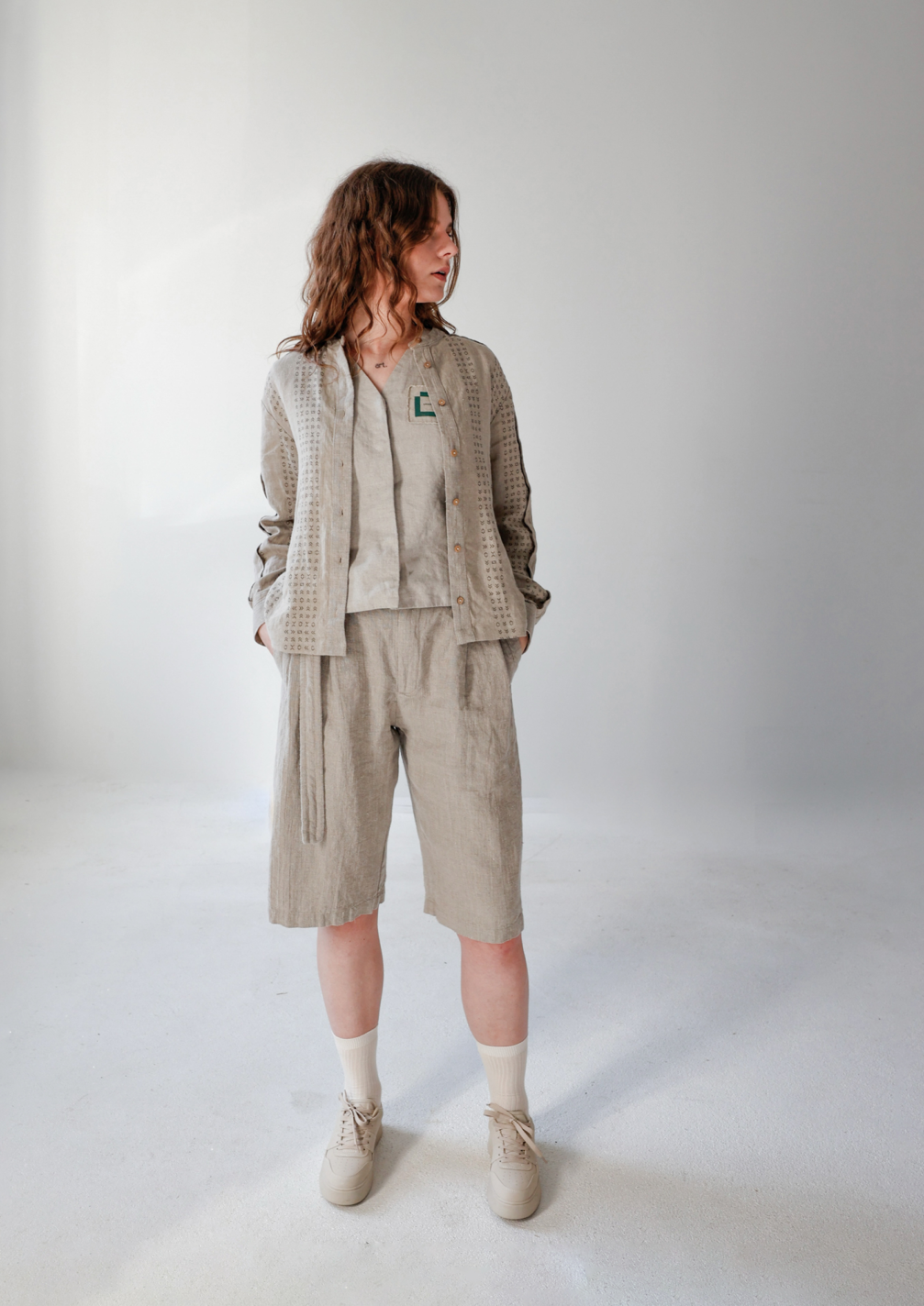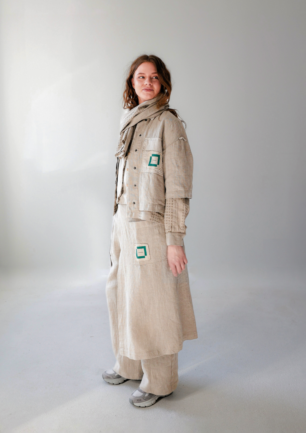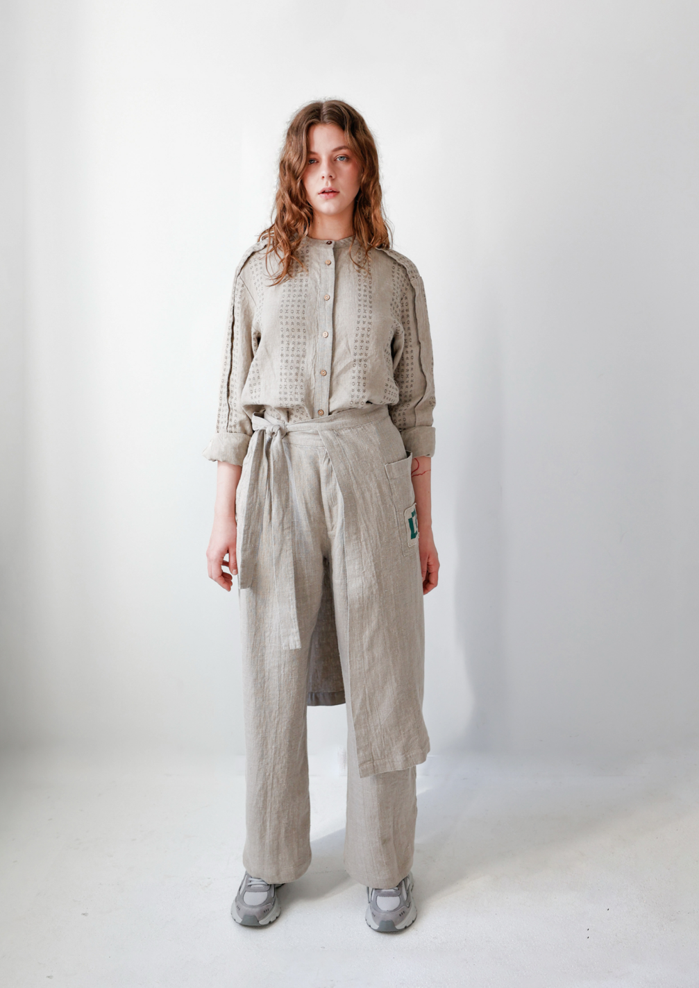 When creating the uniforms for the pavilion staff, designer Gabrielė Januškevičiūtė, who runs the Lined ID brand, was inspired by the Baltic exhibition’s motto, We are One. This determined both the concept of the collection and the choice of a single material. All garments are made from natural-colour linen, a fabric that is characteristic not only of Latvian and Lithuanian culture but is also popular in Japan. The patterns decorating the garments are inspired by Japanese characters, but at the same time, they bear a resemblance to traditional Latvian and Lithuanian symbols. This creates a connection with visitors and serves as an invitation to conversation.