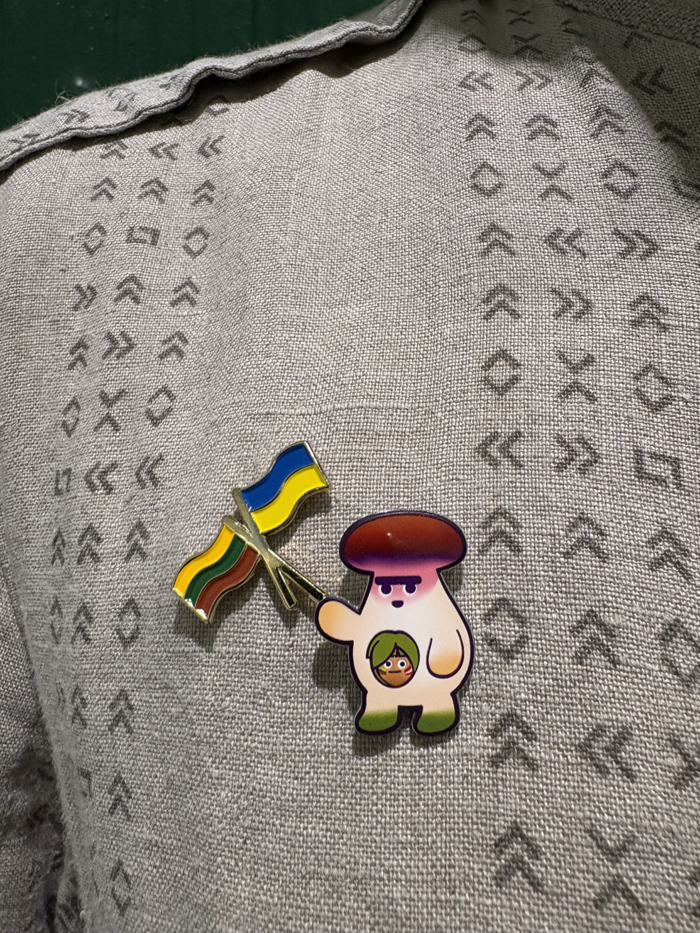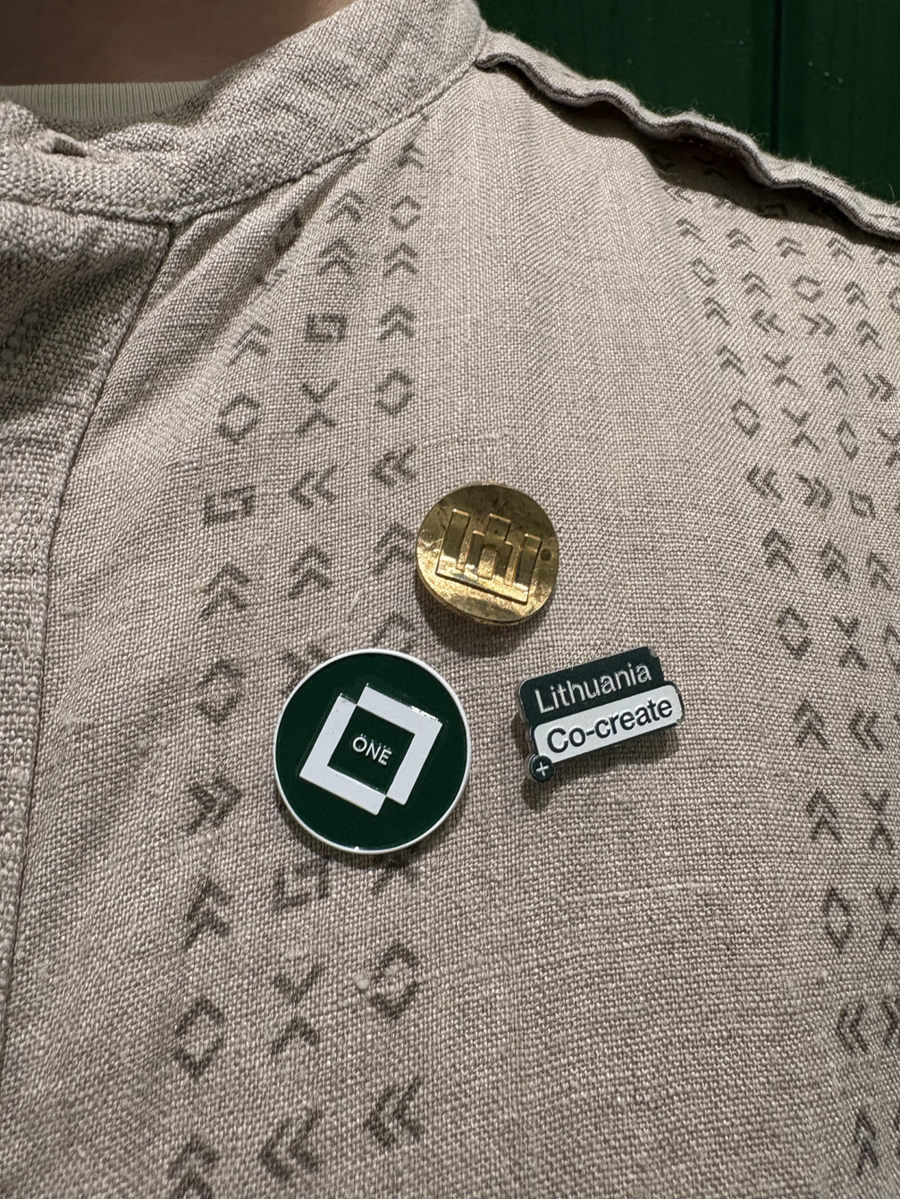 Like the other guides, Matas styles his uniform with his own accessories — a Lithuanian folk costume belt and badges. «Pins are part of the Japanese Expo culture; they help us start conversations with visitors and find a common language. Our pavilion is special in that we establish a very personal connection with visitors, so we also receive pins as gifts,» says Matas.
