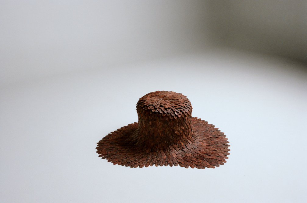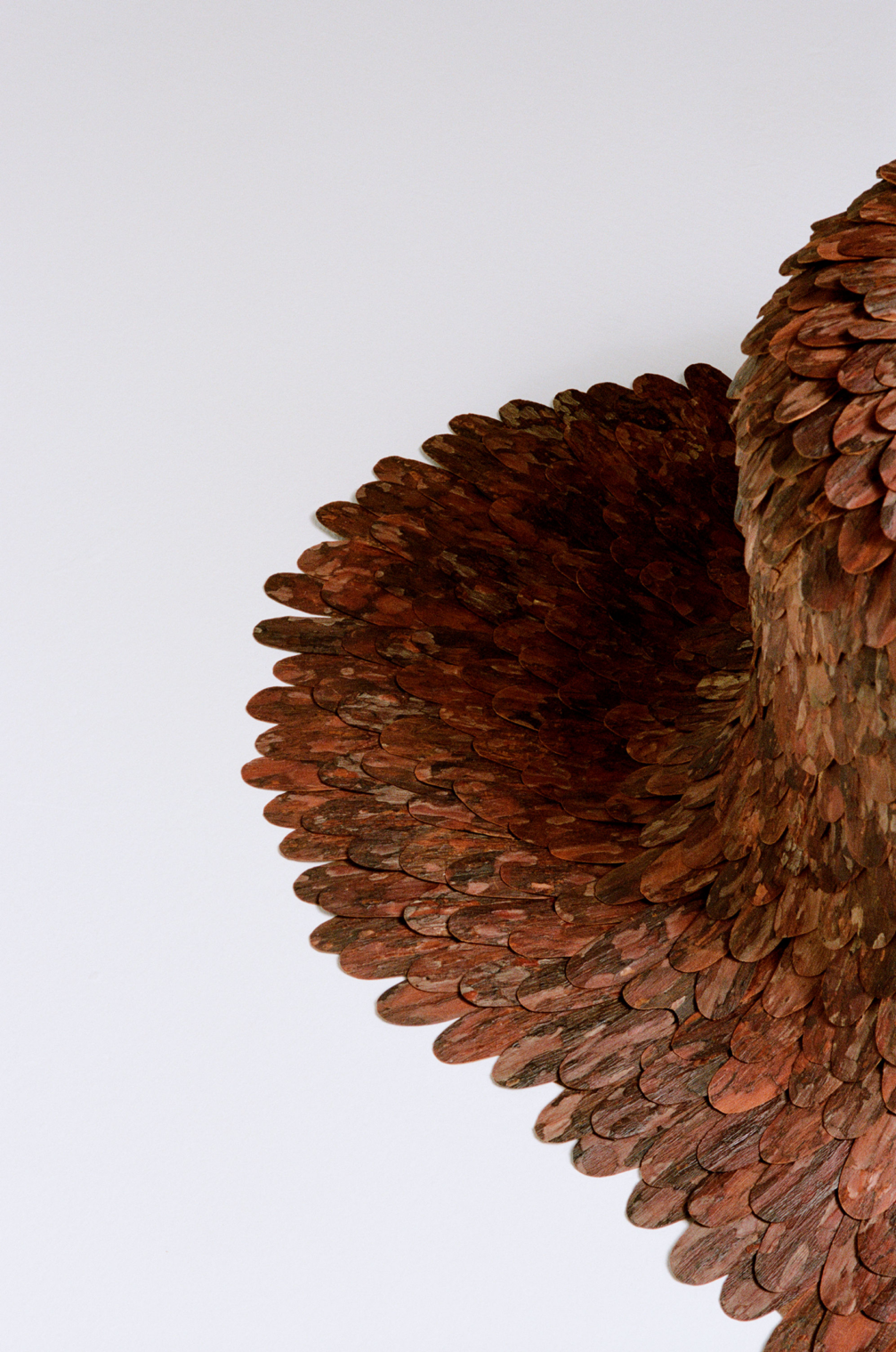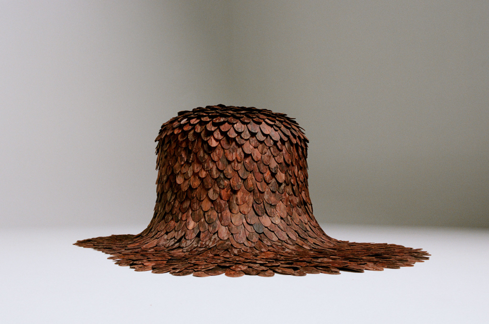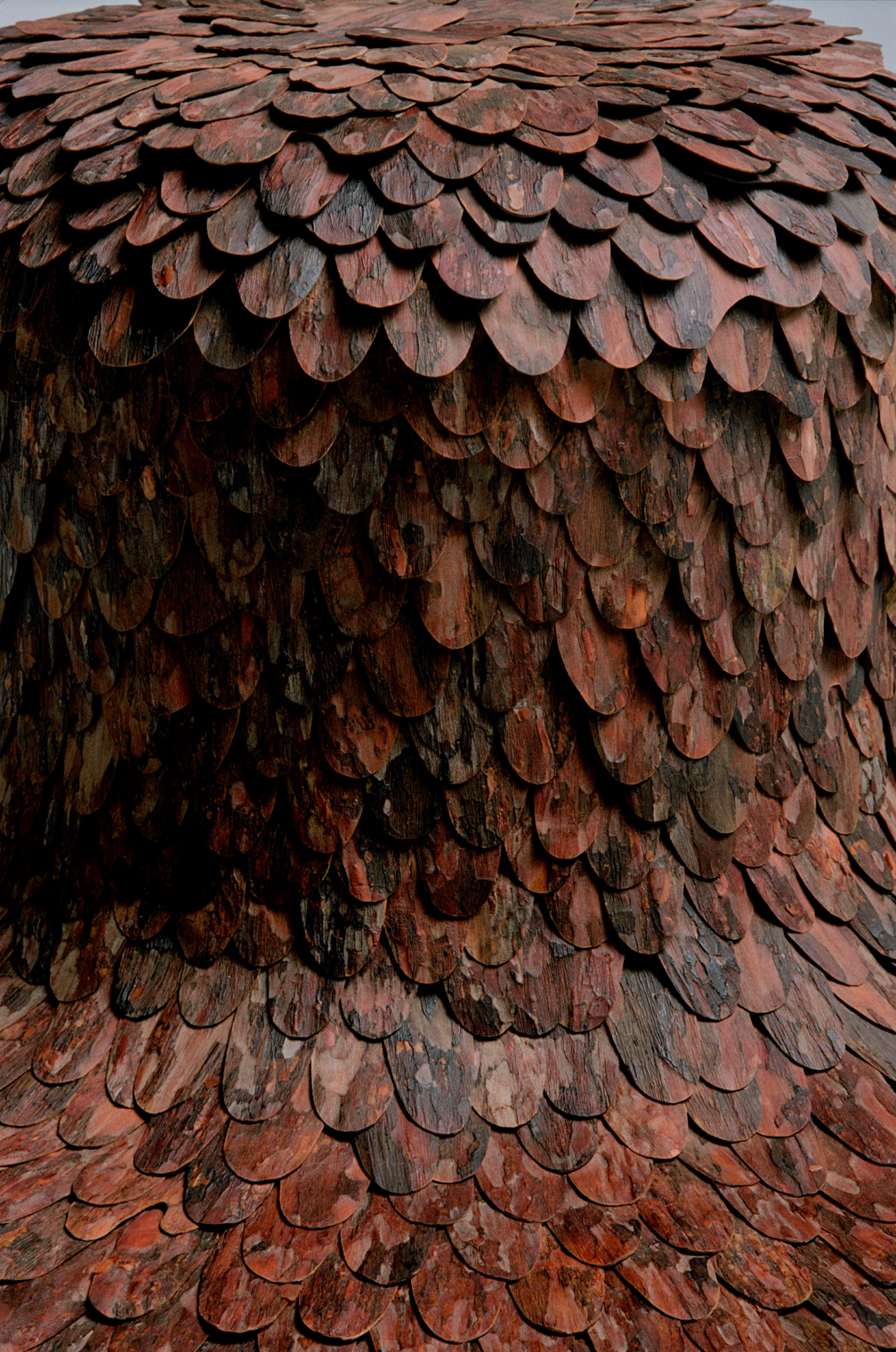 The PineSkins pouf not only encourages new practices in the timber industry but also views forest resources in a broader context, prompting us to rethink our relationship with the forest. The sculptural object blurs the boundaries between functional furniture and artefact, its form reminiscent of both a tree stump and an abstract relief. The design of the pouf was inspired by Imants Ziedonis’ Green Fairytale, which tells the story of the forest coming to the city. The poet writes: «The forest kept coming, coming, with so many blossoms and leaves that noises soon were overgrown with moss. Soft and velvety at first, they still scampered about, but then they got heavier and heavier, until they fell down, green and silent as knolls in the forest. Just as the forest overtakes the city, Sarmīte has covered the pouf with more than 2000 PineSkins scales.