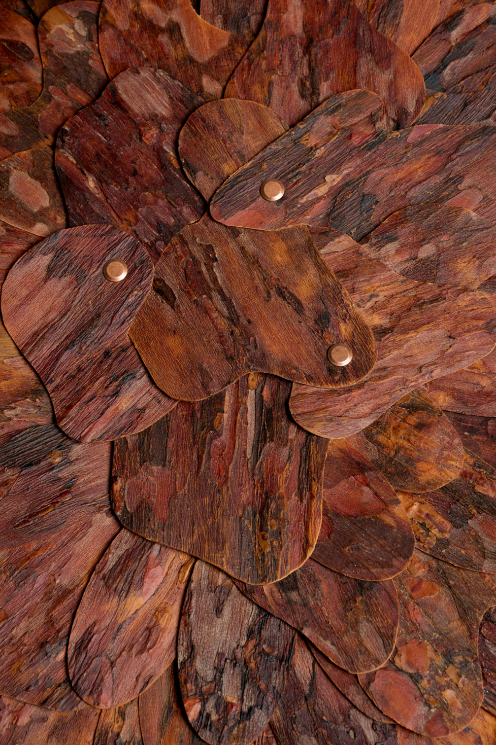 Have forests become factories for timber? Sarmīte Poļakova, founder of Studio Sarmīte, points out that pine trees are the main source of timber in the world. In Europe alone, more than 600 million pine trees are cut down every year. However, almost half of each tree — the bark, needles, and thinner branches — is discarded as waste. The PineSkins material developed by Sarmīte rethinks the wasted potential of pine bark, offering an alternative production paradigm for the timber industry that shifts the focus from efficiency to diversity.