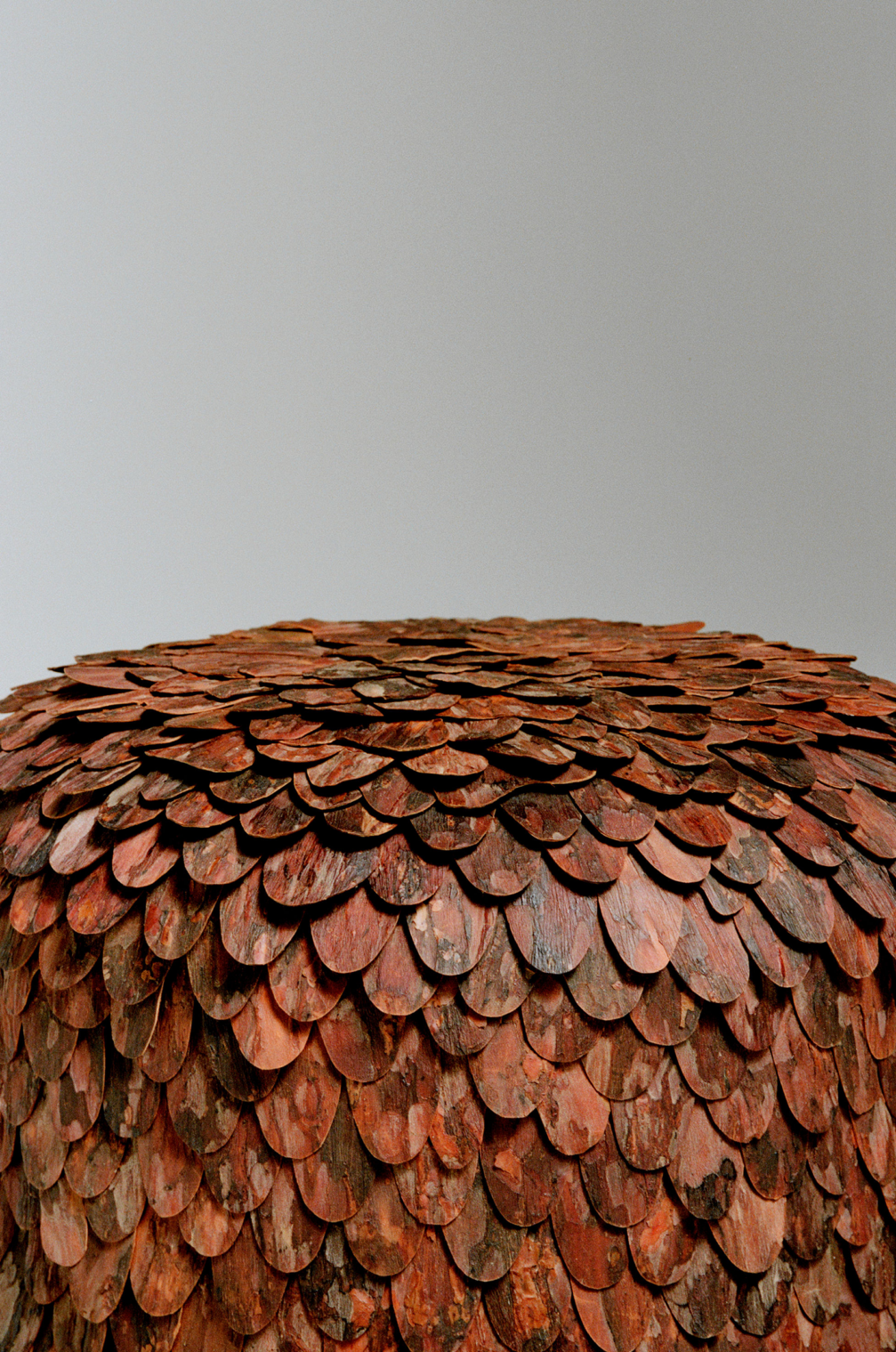 The Latvian design exhibition 89th Second at Expo 2025 Osaka invites visitors to think about climate and responsibility through different interpretations of one of our national symbols — the pine tree. Studio Sarmīte is presenting the PineSkins pouf, a functional yet sculptural object covered with scales made from innovative softened pine bark material. With this work, designer Sarmīte Poļakova encourages both an alternative production paradigm in the wood industry and reimagining our relationships with the forest.