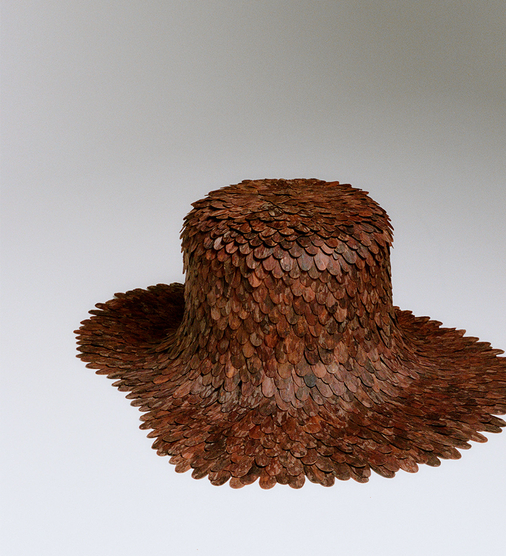 The Latvian design exhibition 89th Second at Expo 2025 Osaka invites visitors to think about climate and responsibility through different interpretations of one of our national symbols — the pine tree. Studio Sarmīte is presenting the PineSkins pouf, a functional yet sculptural object covered with scales made from innovative softened pine bark material. With this work, designer Sarmīte Poļakova encourages both an alternative production paradigm in the wood industry and reimagining our relationships with the forest.