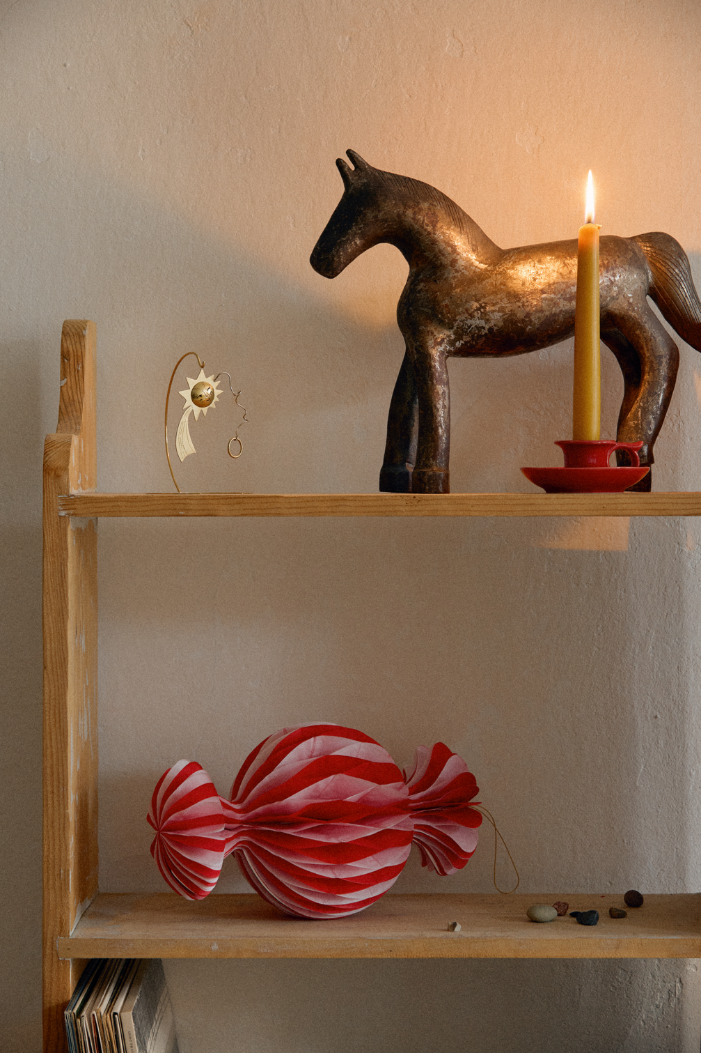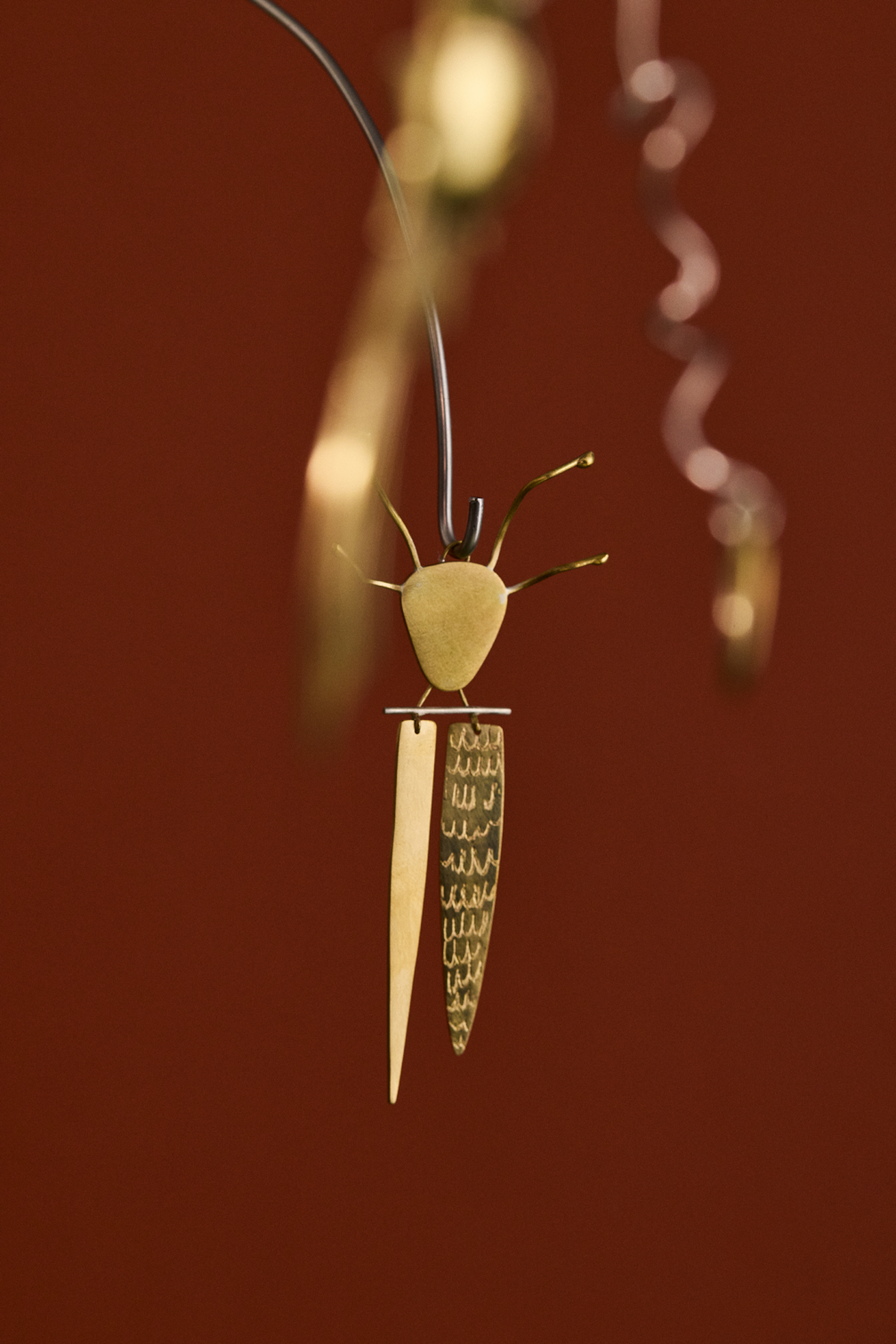 The Parade of Winter Guardians consists of six interior objects — miniature sculptures — and a kinetic mobile that symbolically reflects the myths of the creation of the world. The images in the collection are inspired by Latvian masking traditions and processes in nature, depicting various figures and symbols significant in Latvian folklore — the Wolf and the Goat, the Moonbeam, the Circle of Time, the Golden Trout, and the Giant carrying the Sun on his shoulders.