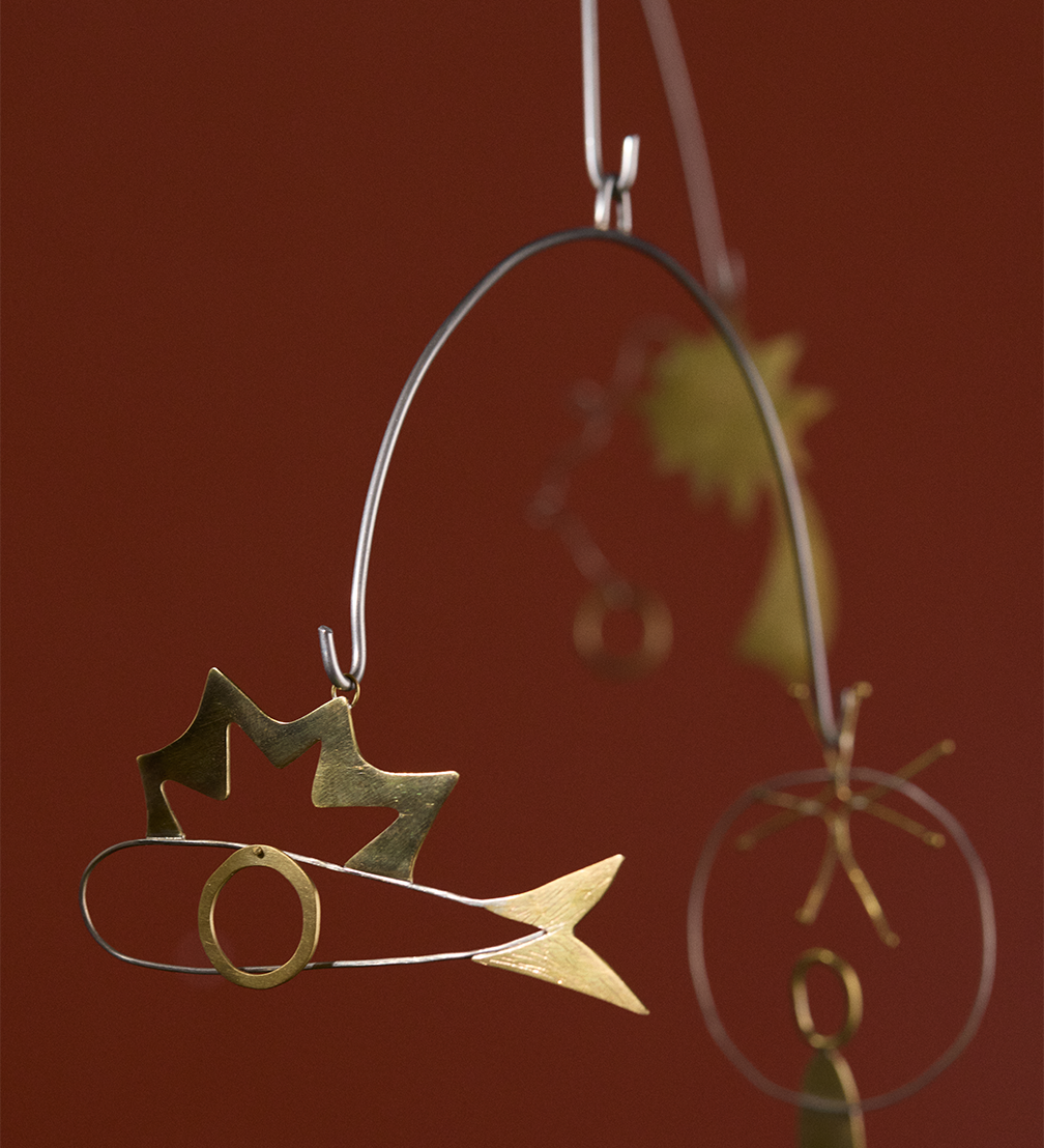 The Parade of Winter Guardians consists of six interior objects — miniature sculptures — and a kinetic mobile that symbolically reflects the myths of the creation of the world. The images in the collection are inspired by Latvian masking traditions and processes in nature, depicting various figures and symbols significant in Latvian folklore — the Wolf and the Goat, the Moonbeam, the Circle of Time, the Golden Trout, and the Giant carrying the Sun on his shoulders.