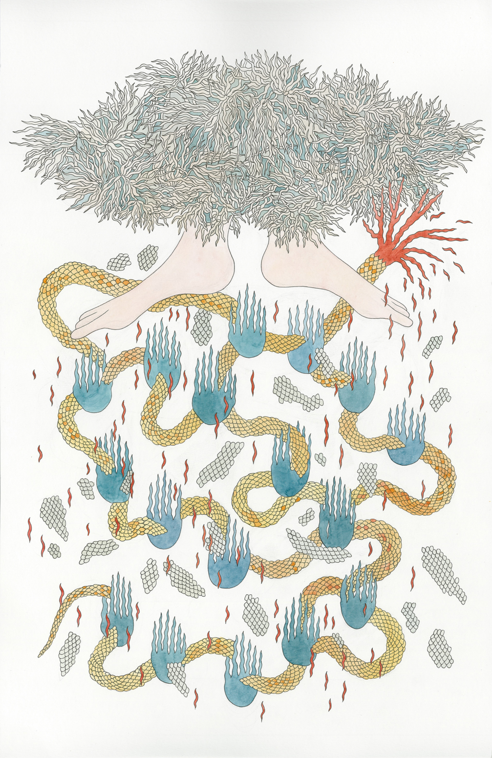 The illustrations refer to Hildegard’s text and at the same time reveal Linda’s own feelings and experiences. For example, the illustration for Modesty (Verecundia) shows feet crushing a snake, which directly echoes the text of Modesty in the play: «I cover over, drive away, or tread down all the filths of the Devil.» At the same time, the footprints are a reference to a sculpture by Anda Poikāne, an artist close to Linda. «I found it very amusing to draw Modesty, who is also fierce and tenacious,» says Linda. A similar contrast is also included in the illustration of Humility, where the high status of the queen of virtues is depicted as striving upwards, while the essence of humility is symbolised by the grass.