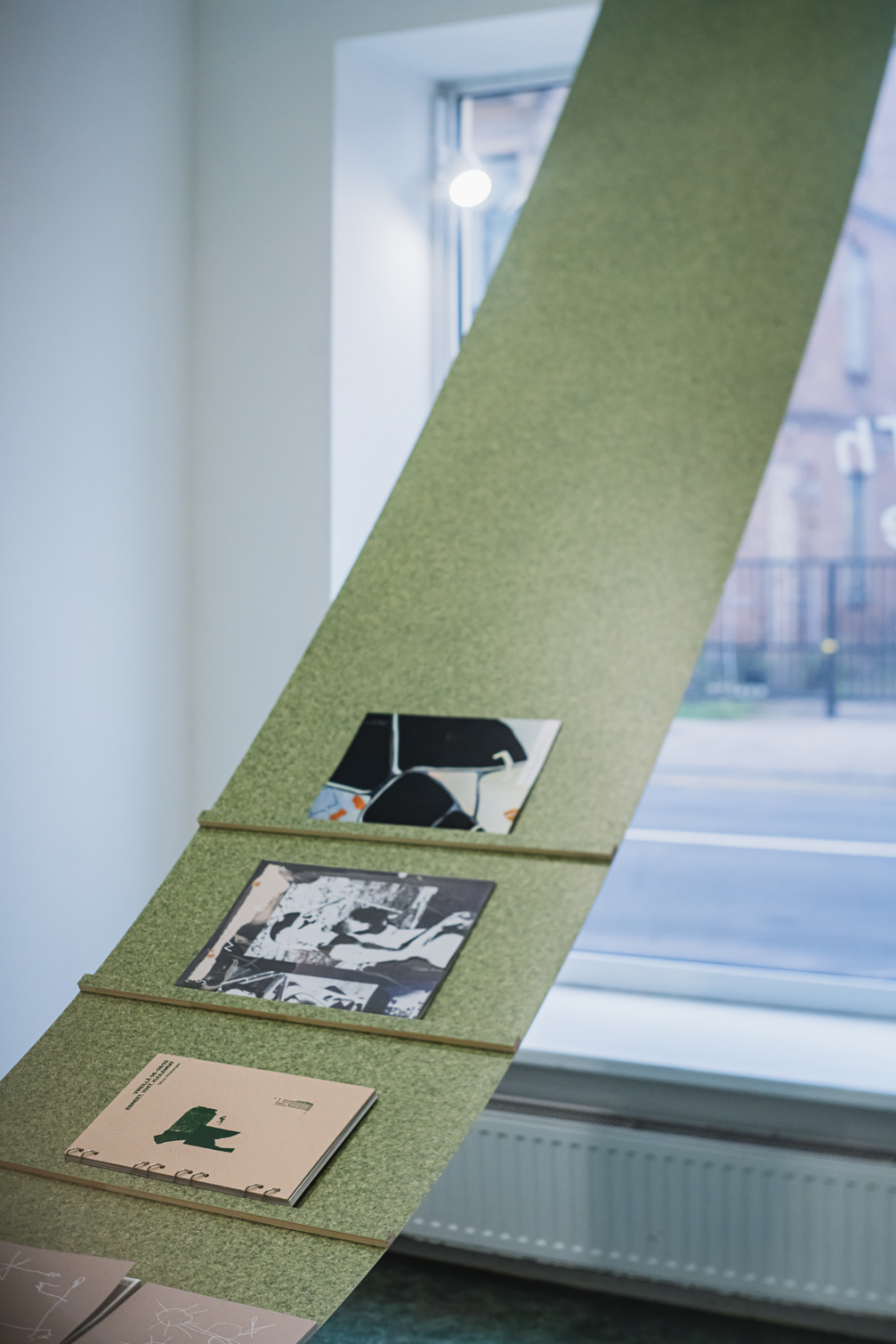 «The publications selected for the exhibition all deal with the observation of space in one way or another. When planning the installation, we sought inspiration in the real, physical space of the Part Time gallery,» says Kārlis Melzobs from Gaiss. He points out that the renovation of the space in the 2000s did not preserve many traces or motifs that could serve as a starting point for the concept of the installation; the most characteristic element of the space is the colourful linoleum, which became the basis for the exhibition.