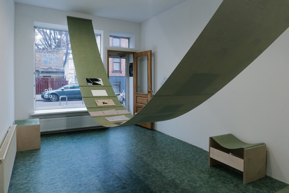 The authors set themselves a conceptual task — to create the installation using this material alone. «On an ideological level, we wanted to leave the space free of furniture, completely stripped. We imagined a scenario in which, by peeling away the layer of linoleum, we could see what lies beneath,» says Arnita Melzoba. The installation is not only an observation of the space but also serves as functional design — the architects have created a large «table» for displaying publications and benches for reading. The surface of the central «table» is a strip of linoleum hung in the room, with the gallery walls serving as the table legs.