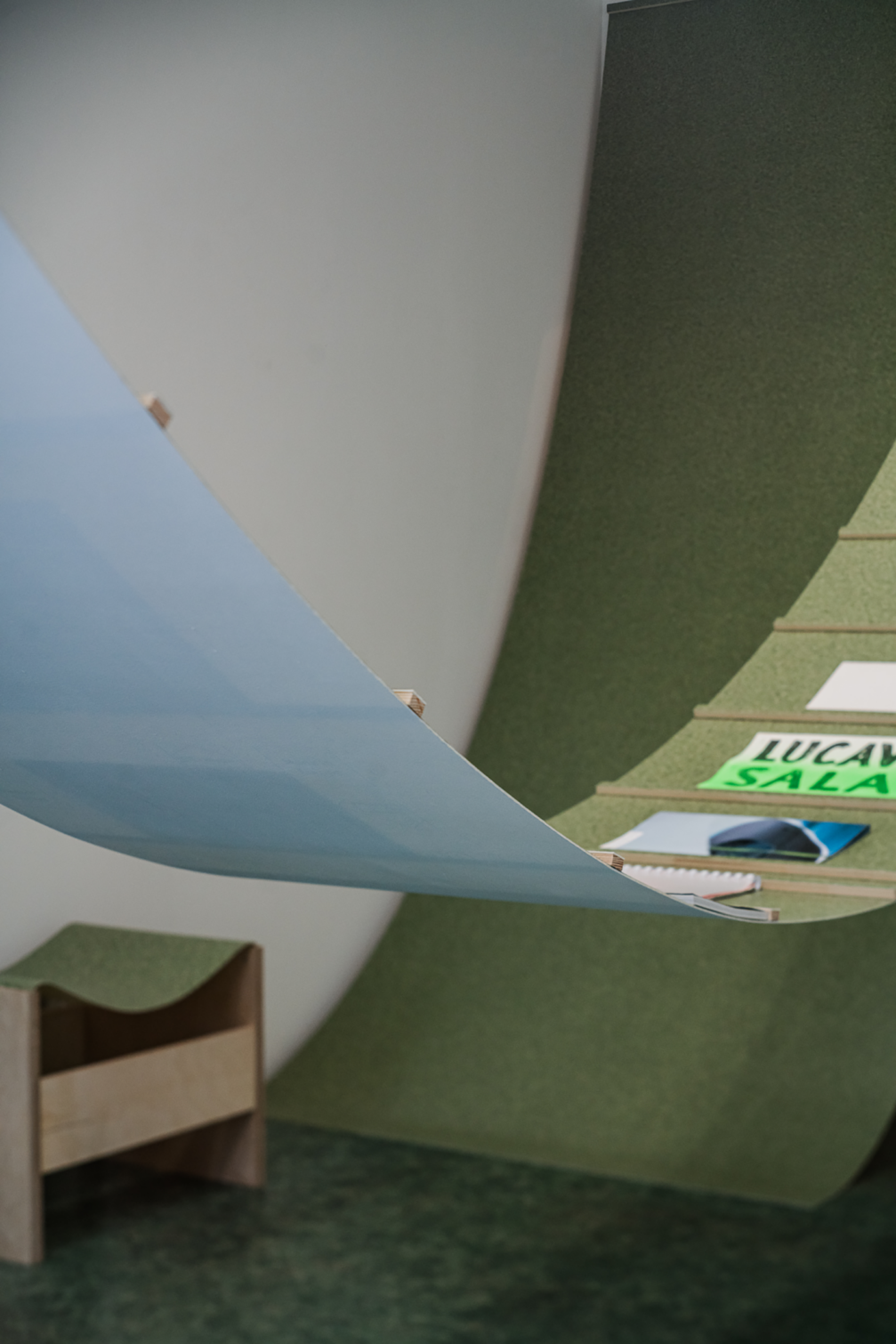 As the authors explain, the solution implemented is not only conceptual but also rational: «To a certain extent, it is a continuation of the approach used in our other exhibition and installation projects — to create the greatest possible spatial effect with the least possible consumption of physical materials. This allows us to reduce the amount of resources used and to work within short-term scenography budgets.» The architects note that exhibition design allows for greater freedom to experiment with different materials, as they are used for a relatively short period of time. This allows them to assess whether a material used in an unorthodox way, such as suspended linoleum, would also serve in the long term.