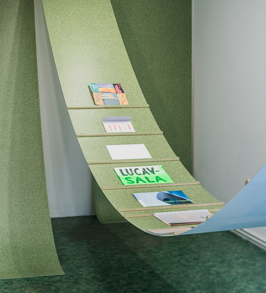 The installation created by Gaiss is «inhabited» by zines and publications of various artists, architects, and designers. The contributions include works by Evita Vasiljeva, Pauls Rietums, Agnese Bebre, Kitija Pekaine, Maike Statz, Liene Pavlovska, and Svens Neilands; books by Olivia Viitakangas and Sauli Sirviö published by Utu Press; as well as an edition of Avīzes Nosaukums created by Kristaps Šulcs and Elīza Brice. «Through the publications on display at the exhibition, artists, designers, and architects observe, bring closer, examine in context, admire, and critique the space, its materiality, the boundaries and possibilities created by the space,» says Liene Pavlovska, co-curator of the exhibition. She points out that the group exhibition is conceived as a conversation between representatives of various creative fields, revealing the diversity of artistic vision in how we view and experience space.