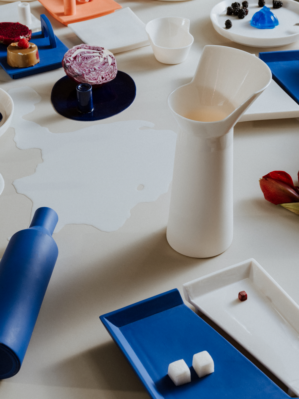 The collection includes 25 designs that can be used both as a complete tableware set and as separate, multifunctional pieces. Throughout the creative process, sustainability was also important to the designer. In order to create the collection with as little waste as possible, it includes the Spill Plate — a free-form dish poured from leftover porcelain mass. Each one is unique, thus emphasising the value of the material and the process.
