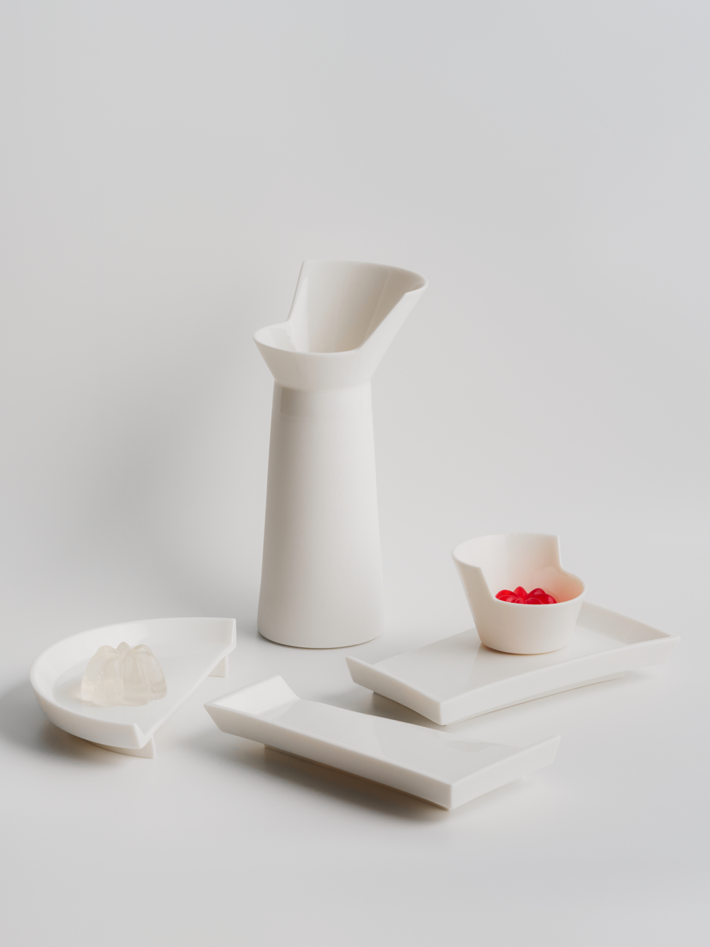 The Opiece porcelain collection deliberately challenges traditional ceramics. The sharp, precise, and geometric forms of the tableware defy porcelain’s natural desire to flow and curve. Furthermore, the colours of the pieces are not achieved by applying glaze but by tinting the porcelain mass itself. Many items are left partially unglazed, allowing the natural texture of the porcelain to be felt. «This is architecture speaking through ceramics. The collection is about breaking the rules, pushing beyond limits, and staying true to oneself,» Zane sums up.